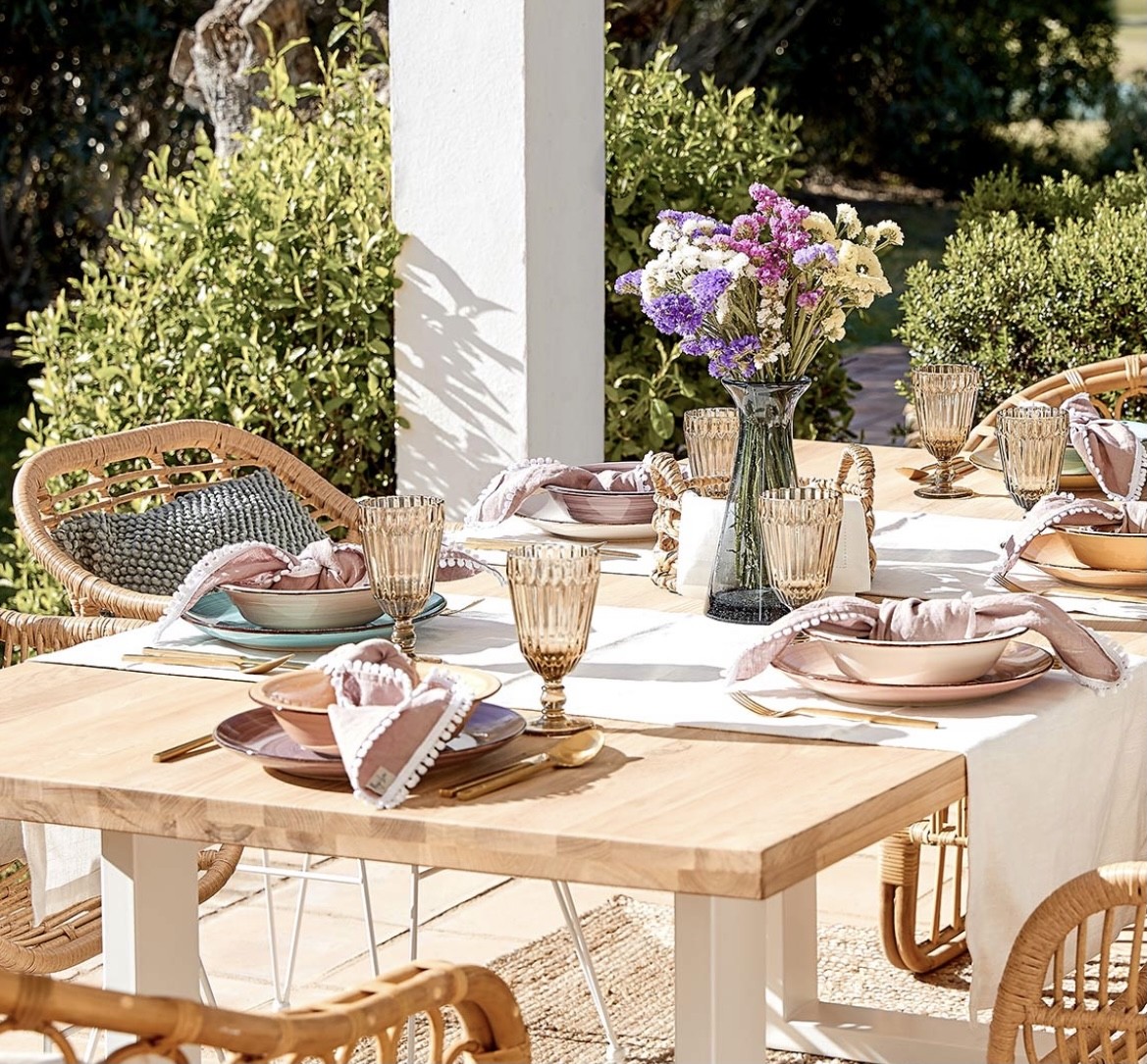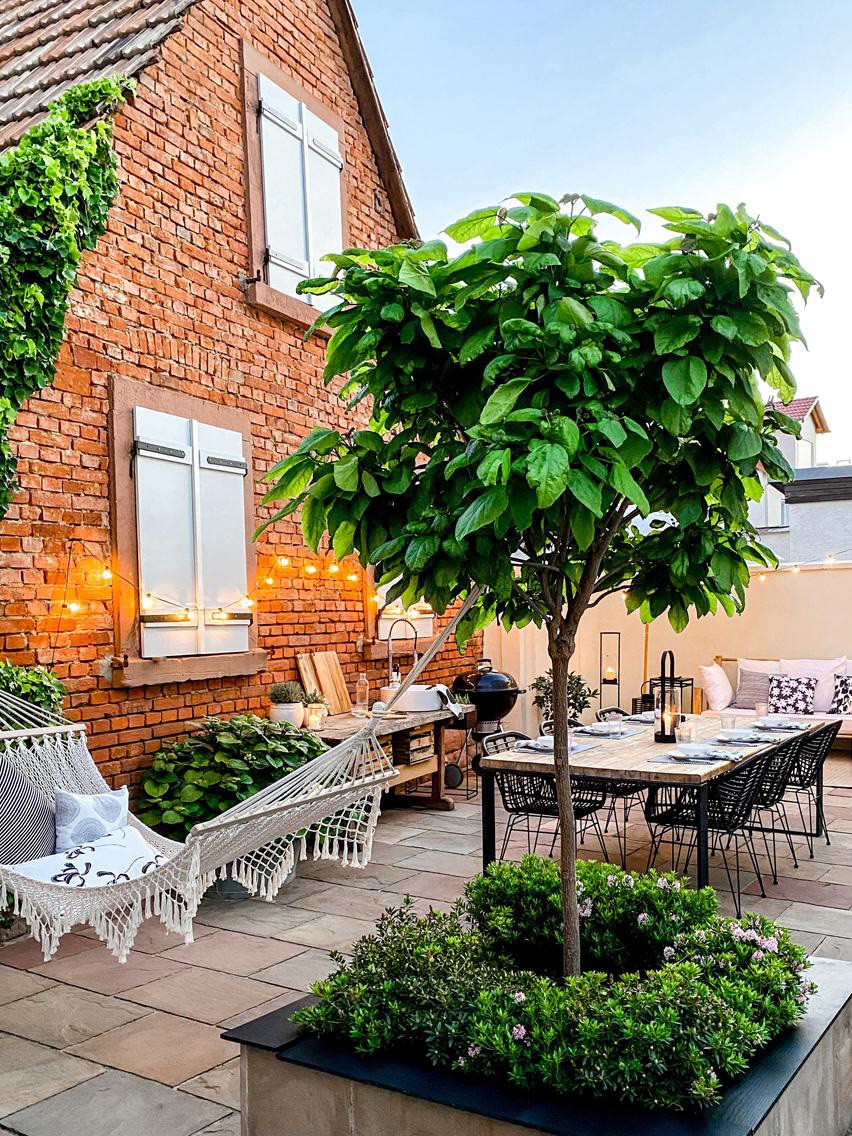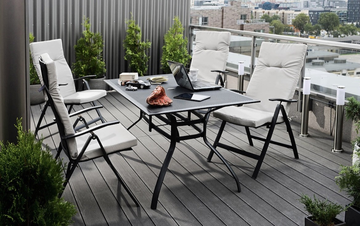 Jeśli masz na tyle dużą przestrzeń postaw na stół z krzesłami – nie ma nic lepszego niż letni obiad na świeżym powietrzu.