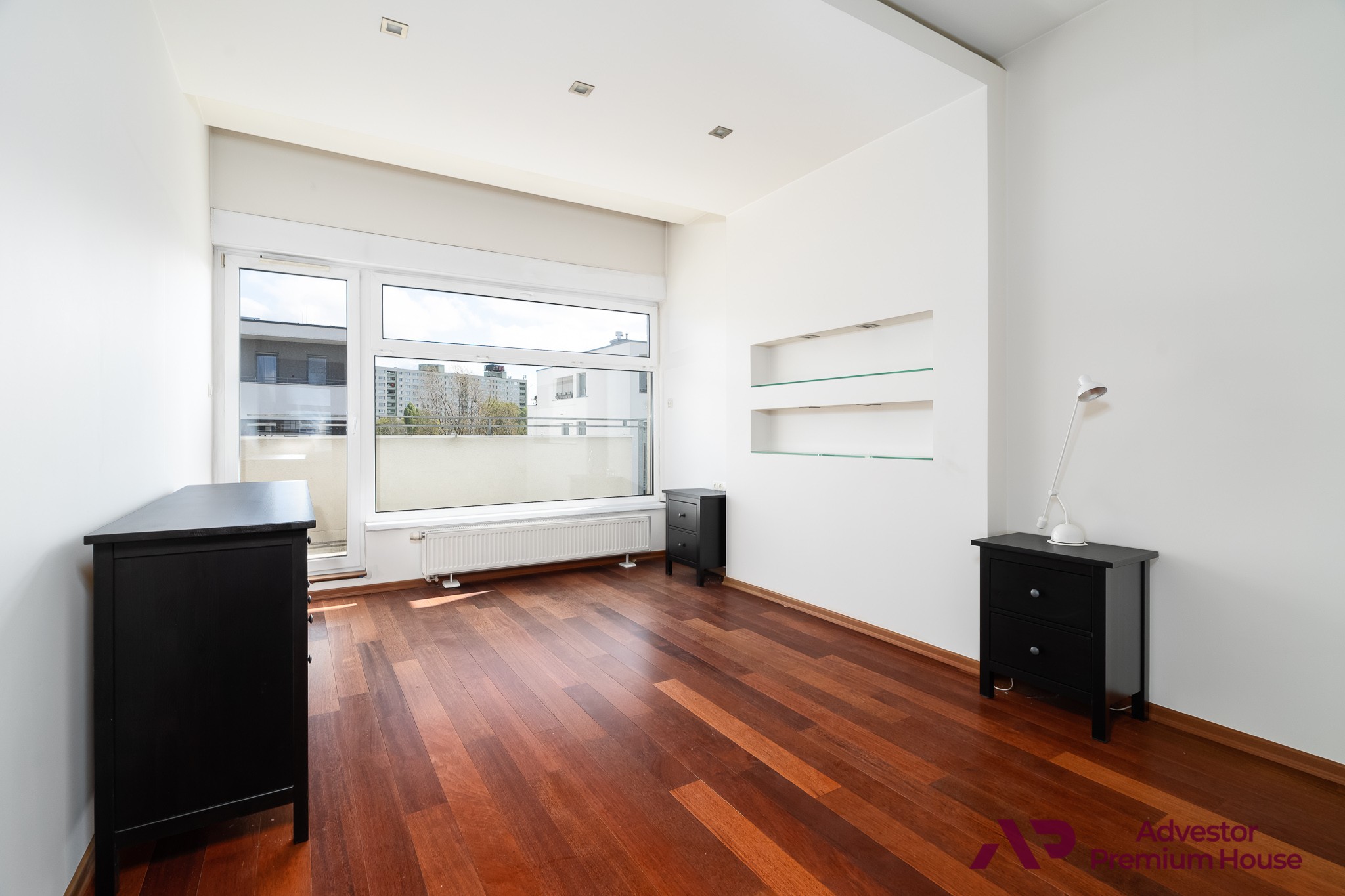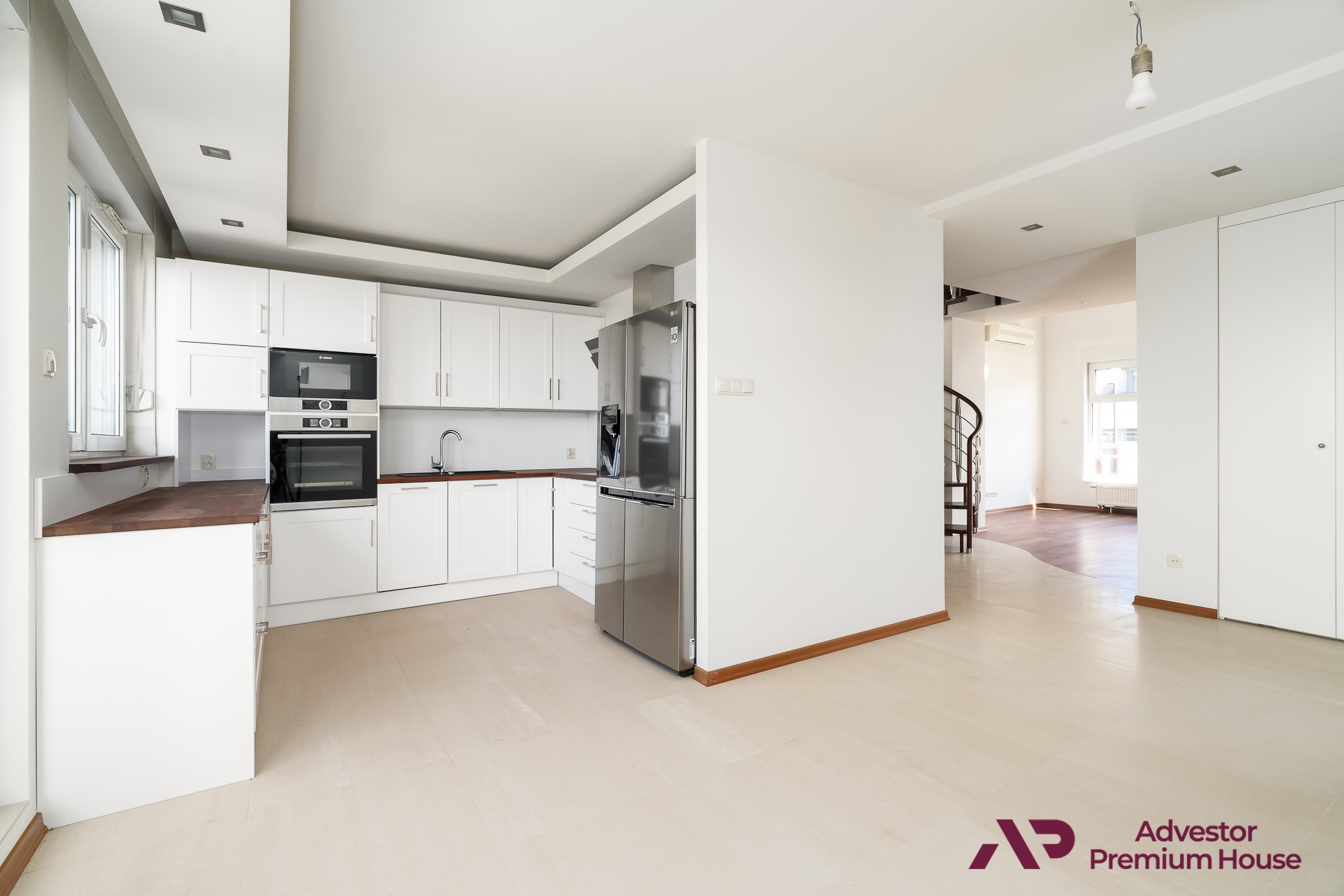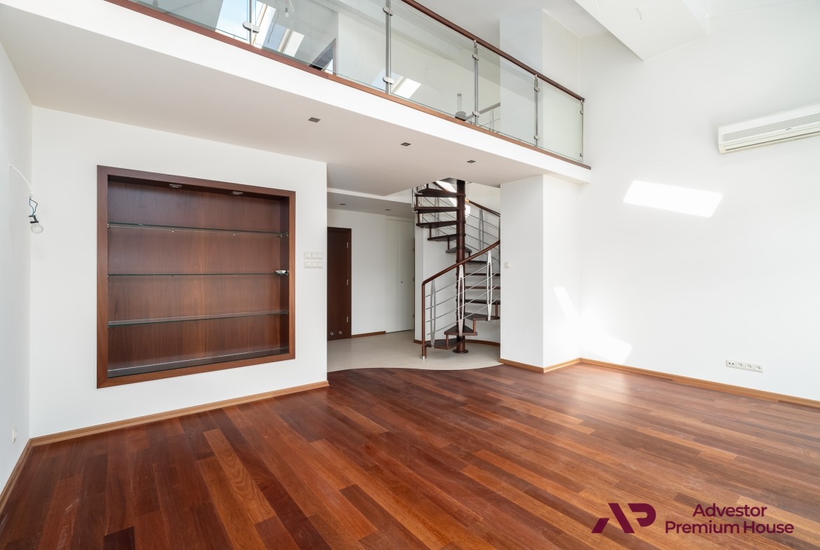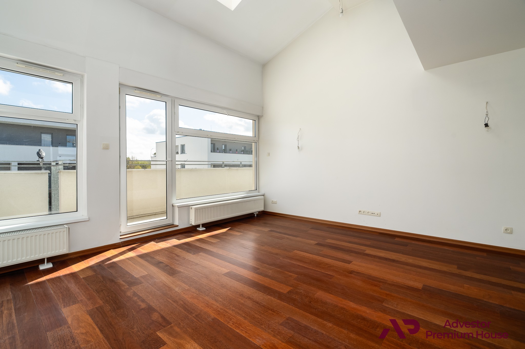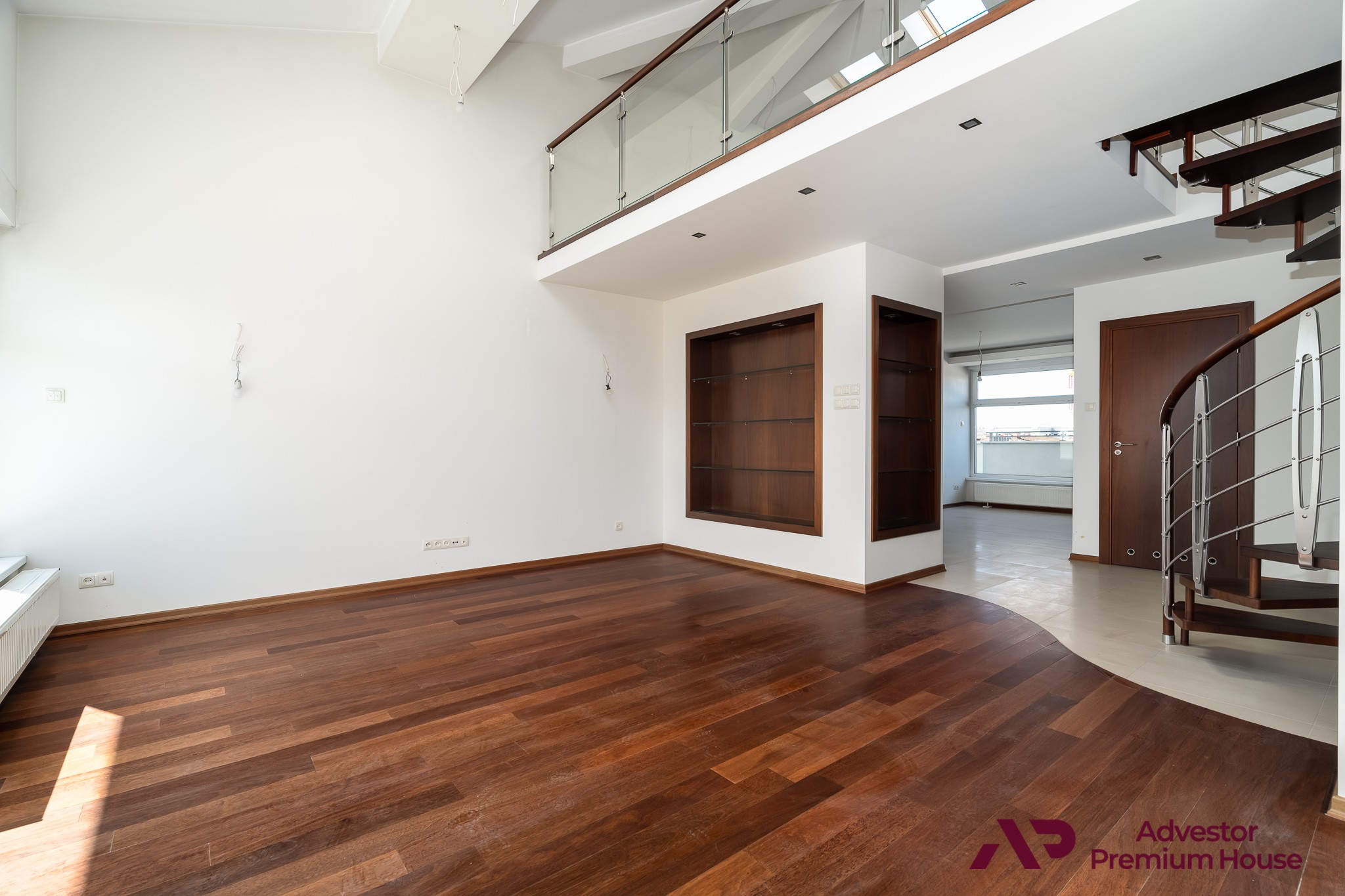Przestronny salon z otwartą antresolą, która stanowi dużą i jasną przestrzeń – jest na niej pokój, prywatna łazienka z prysznicem oraz dwie garderoby. Z salonu mamy wyjście na jeden z dwóch balkonów.