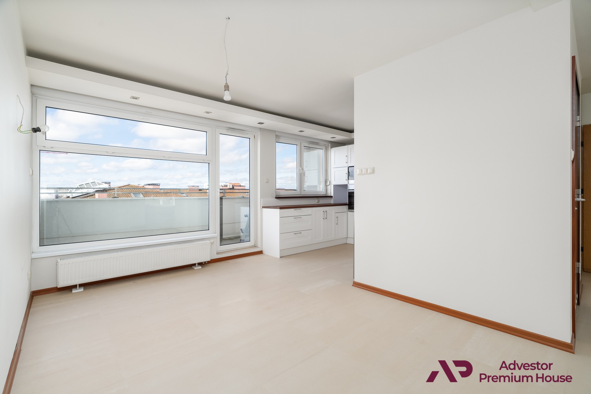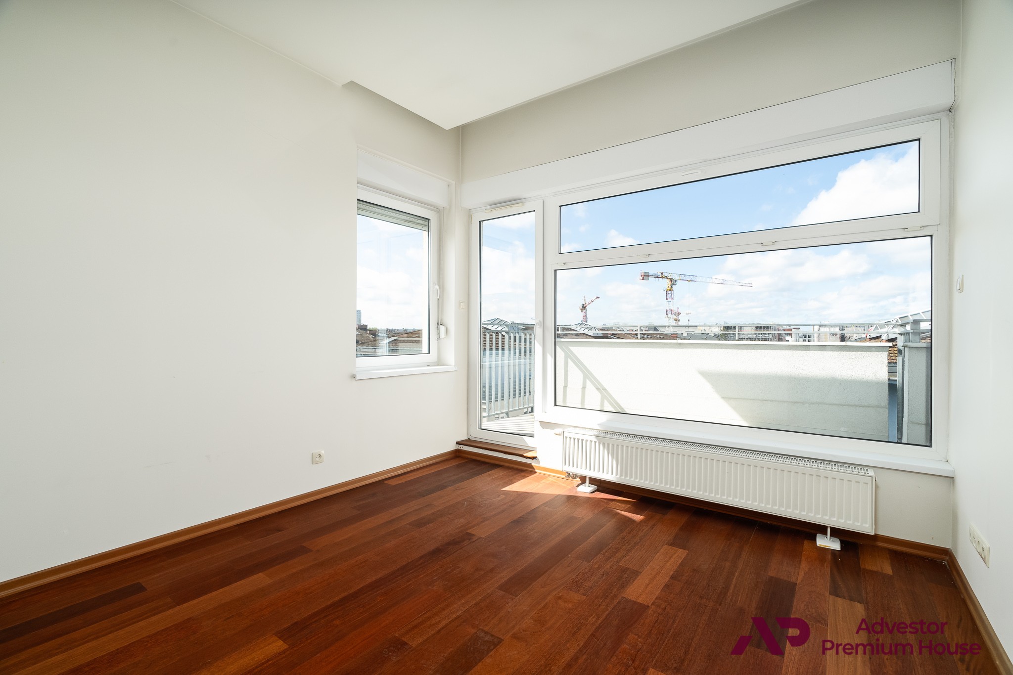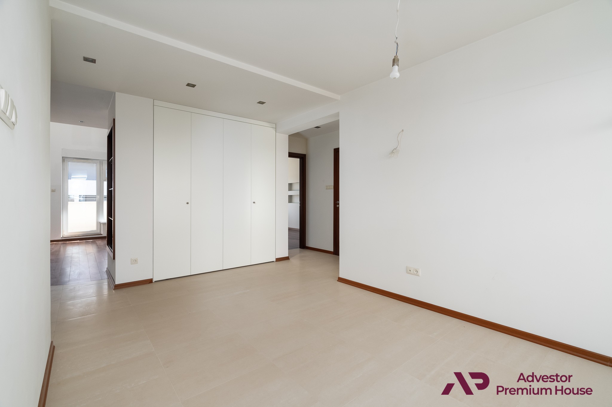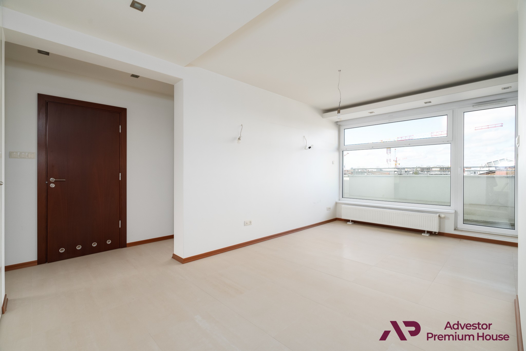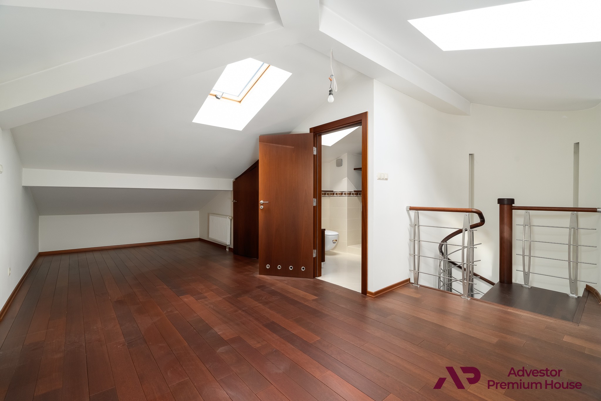 Przestronny salon z otwartą antresolą, która stanowi dużą i jasną przestrzeń – jest na niej pokój, prywatna łazienka z prysznicem oraz dwie garderoby. Z salonu mamy wyjście na jeden z dwóch balkonów.