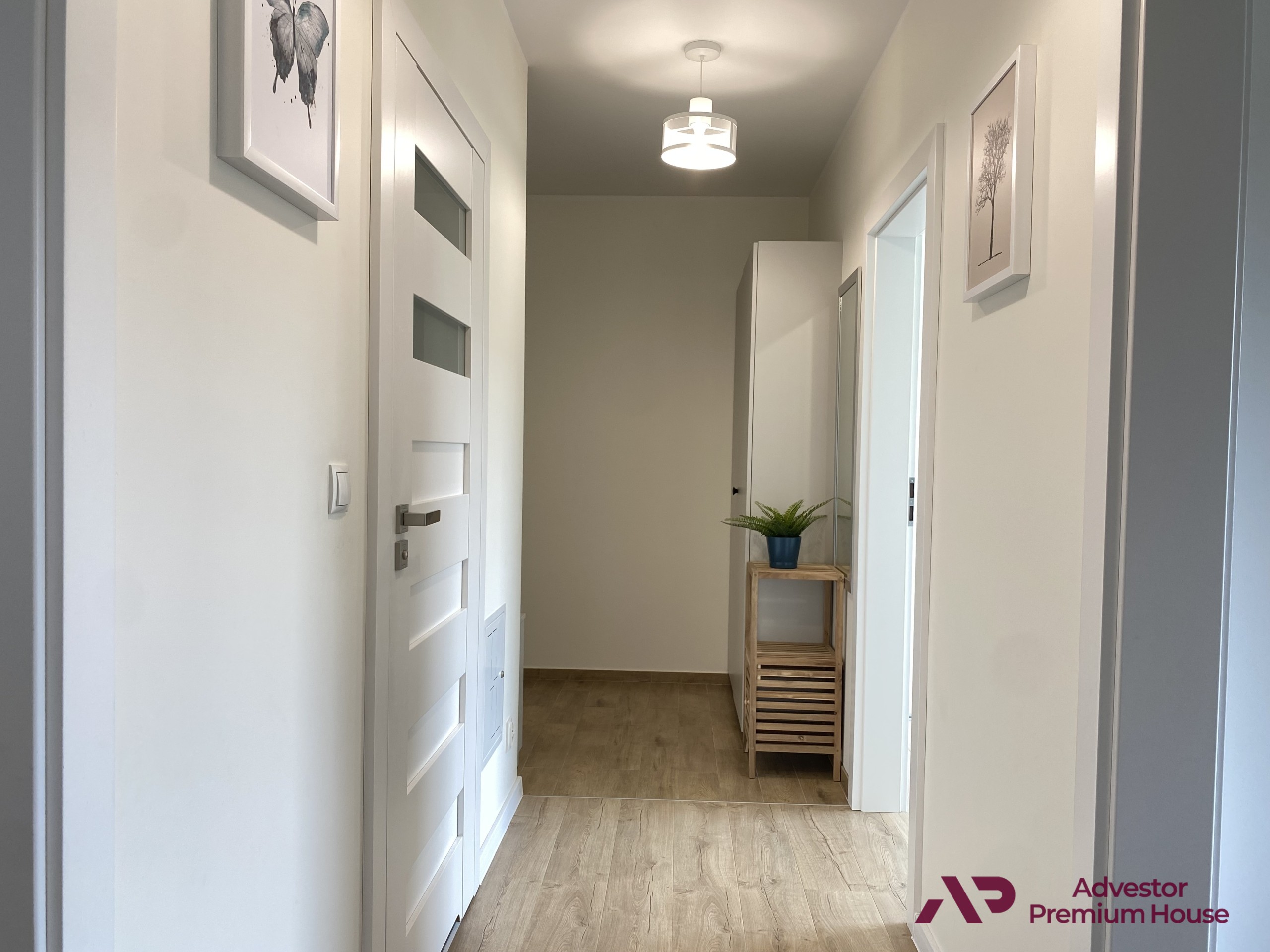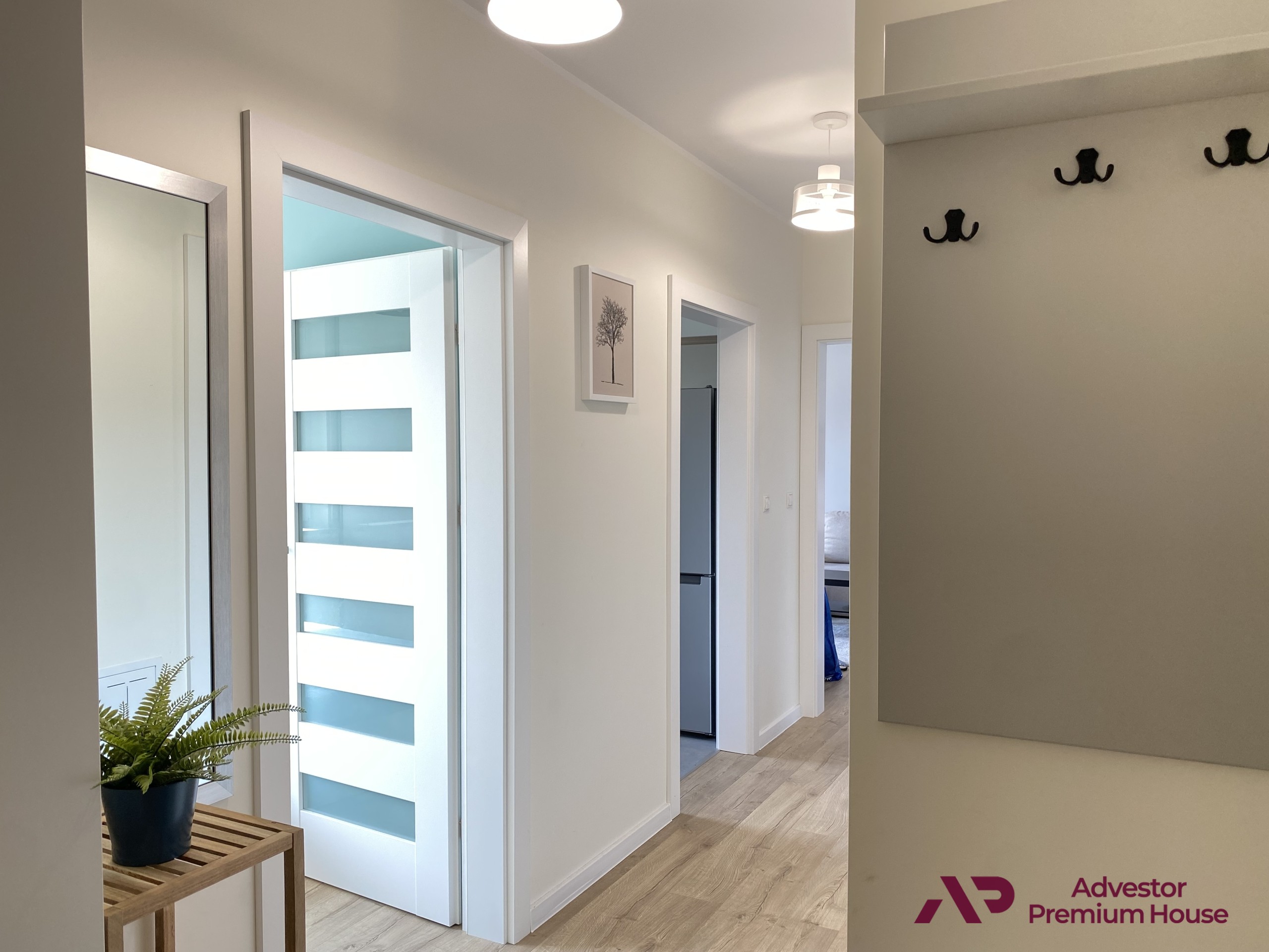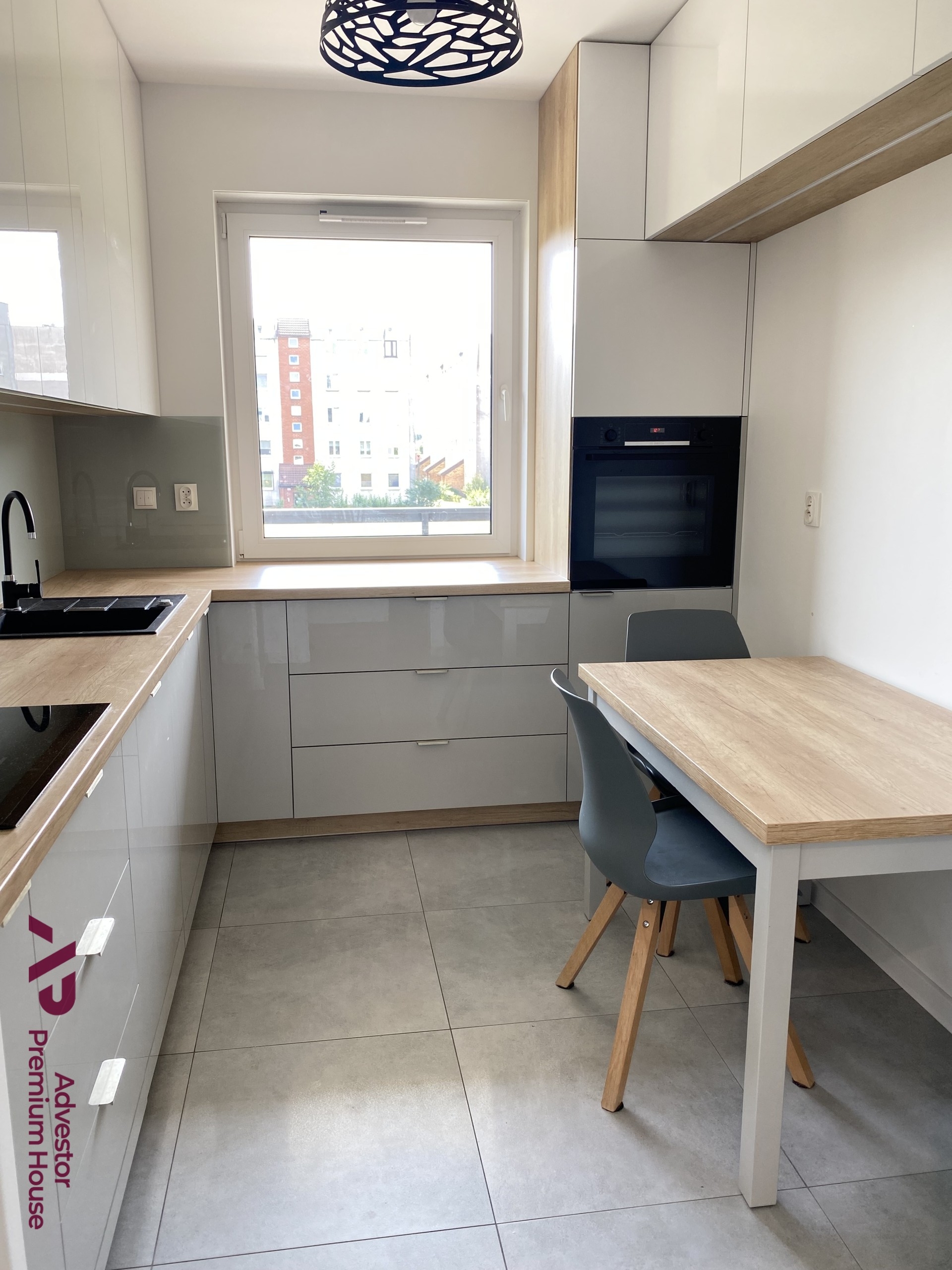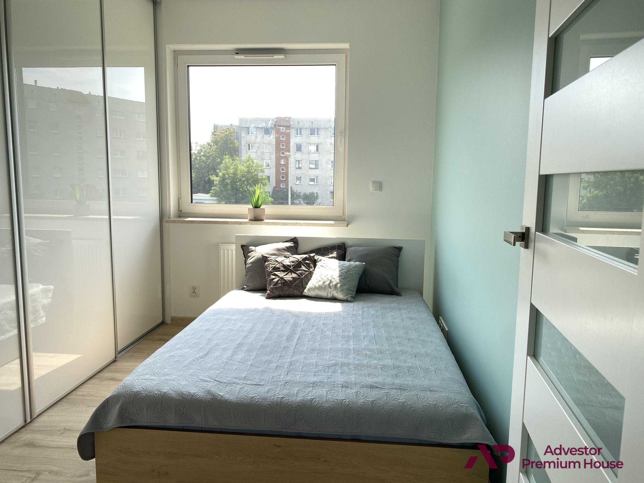 Mieszkanie jest w pełni umeblowane oraz wyposażone w płytę indukcyjną, piekarnik, lodówkę, zmywarkę, pralkę i telewizor. Wzdłuż ściany sypialni postawiono pojemną szafę typu komandor, która idealnie zapewnia miejsce na przechowywanie rzeczy.
