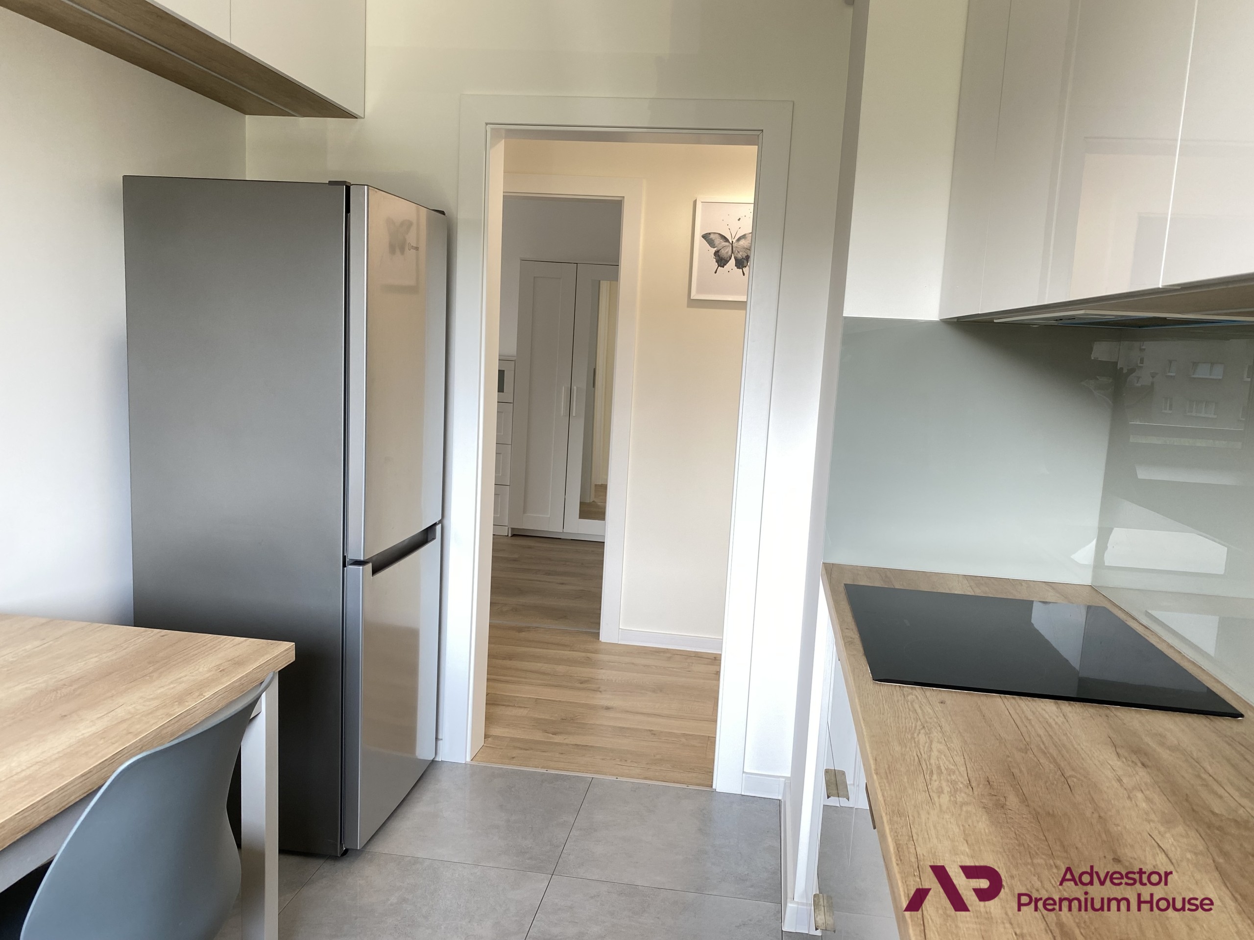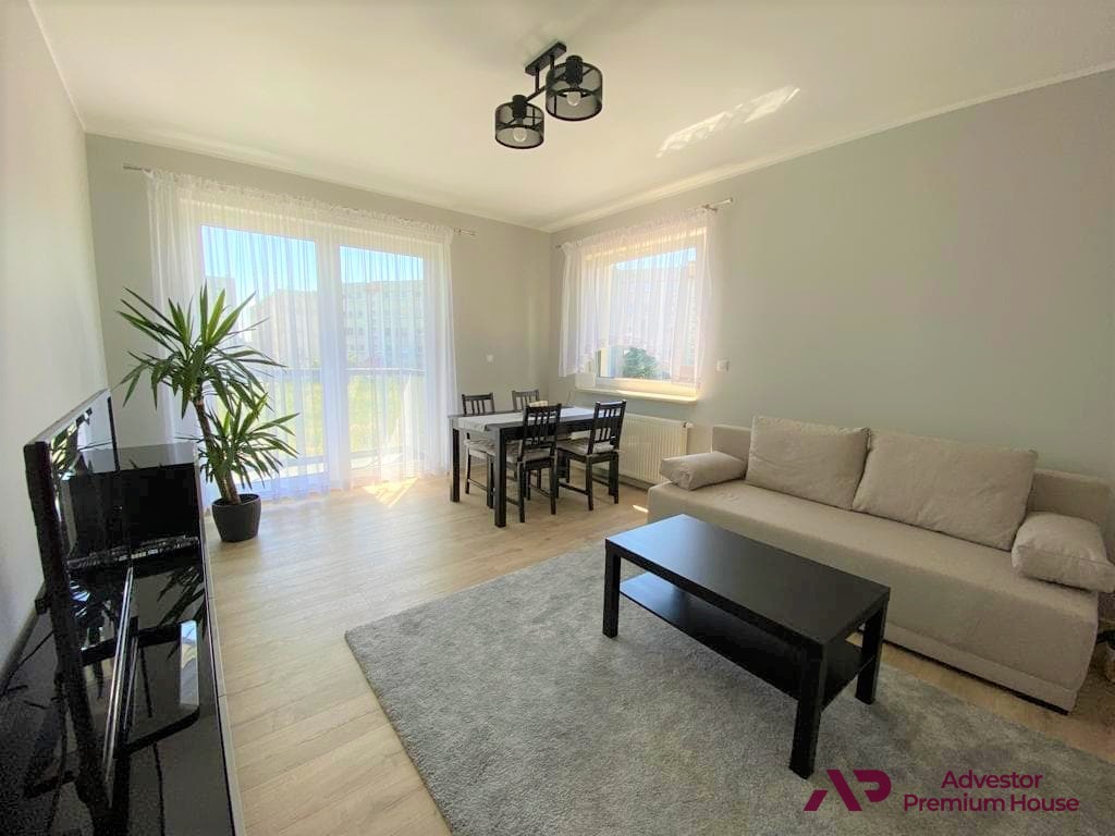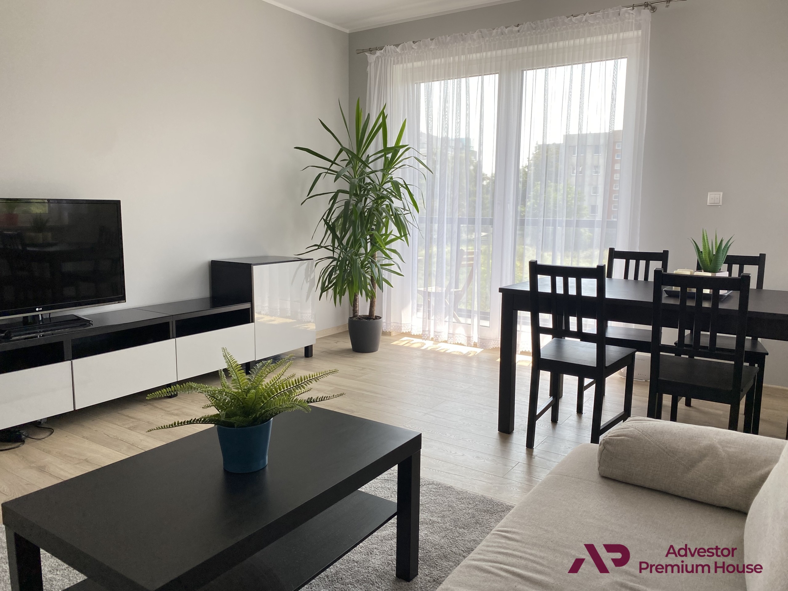 Mieszkanie jest w pełni umeblowane oraz wyposażone w płytę indukcyjną, piekarnik, lodówkę, zmywarkę, pralkę i telewizor. Wzdłuż ściany sypialni postawiono pojemną szafę typu komandor, która idealnie zapewnia miejsce na przechowywanie rzeczy.