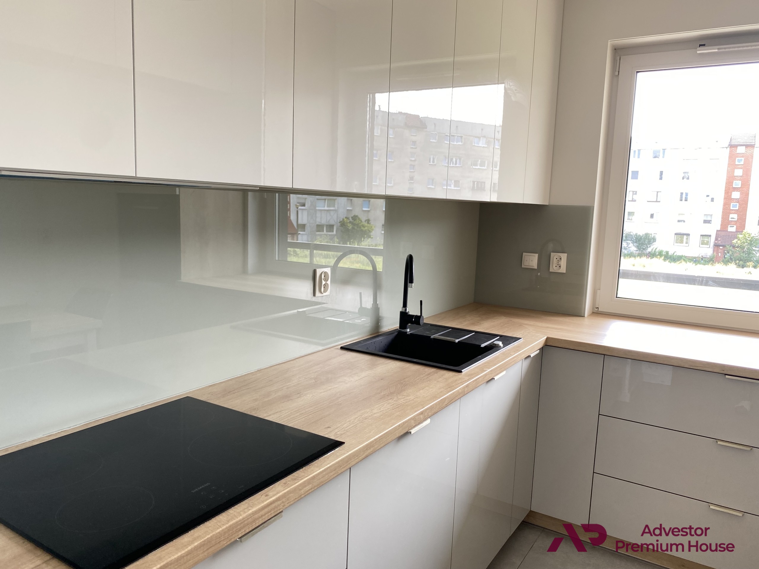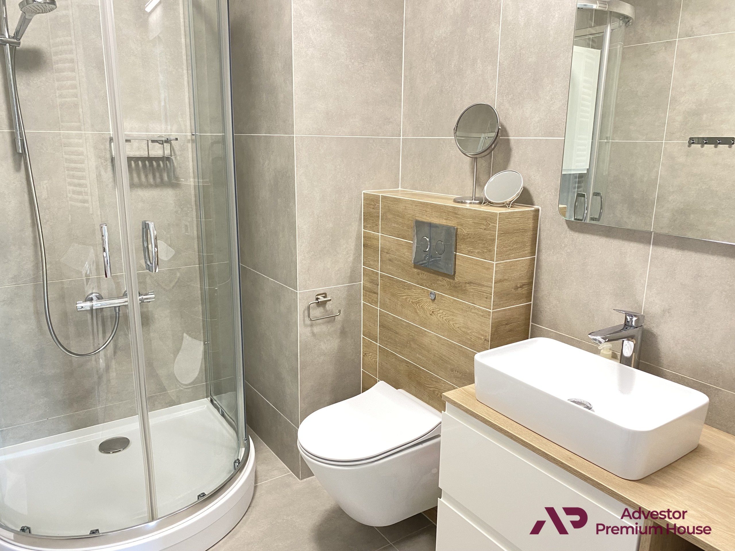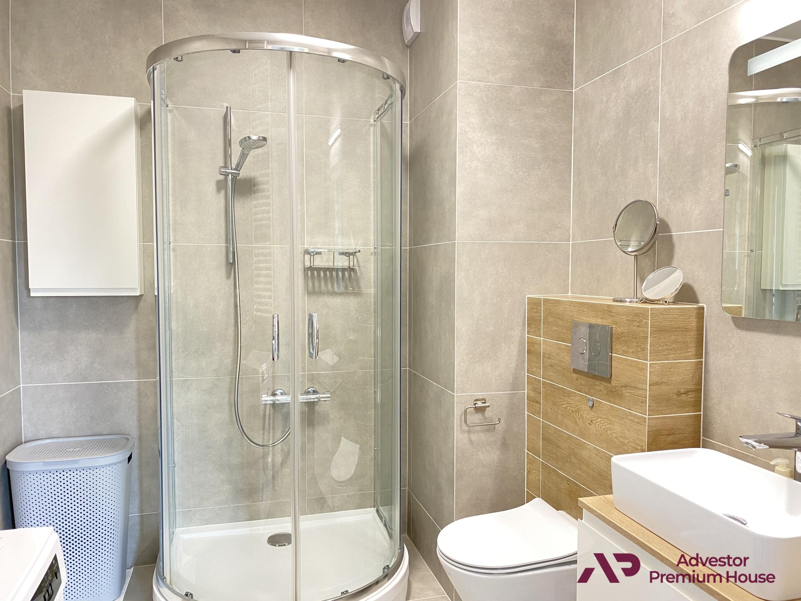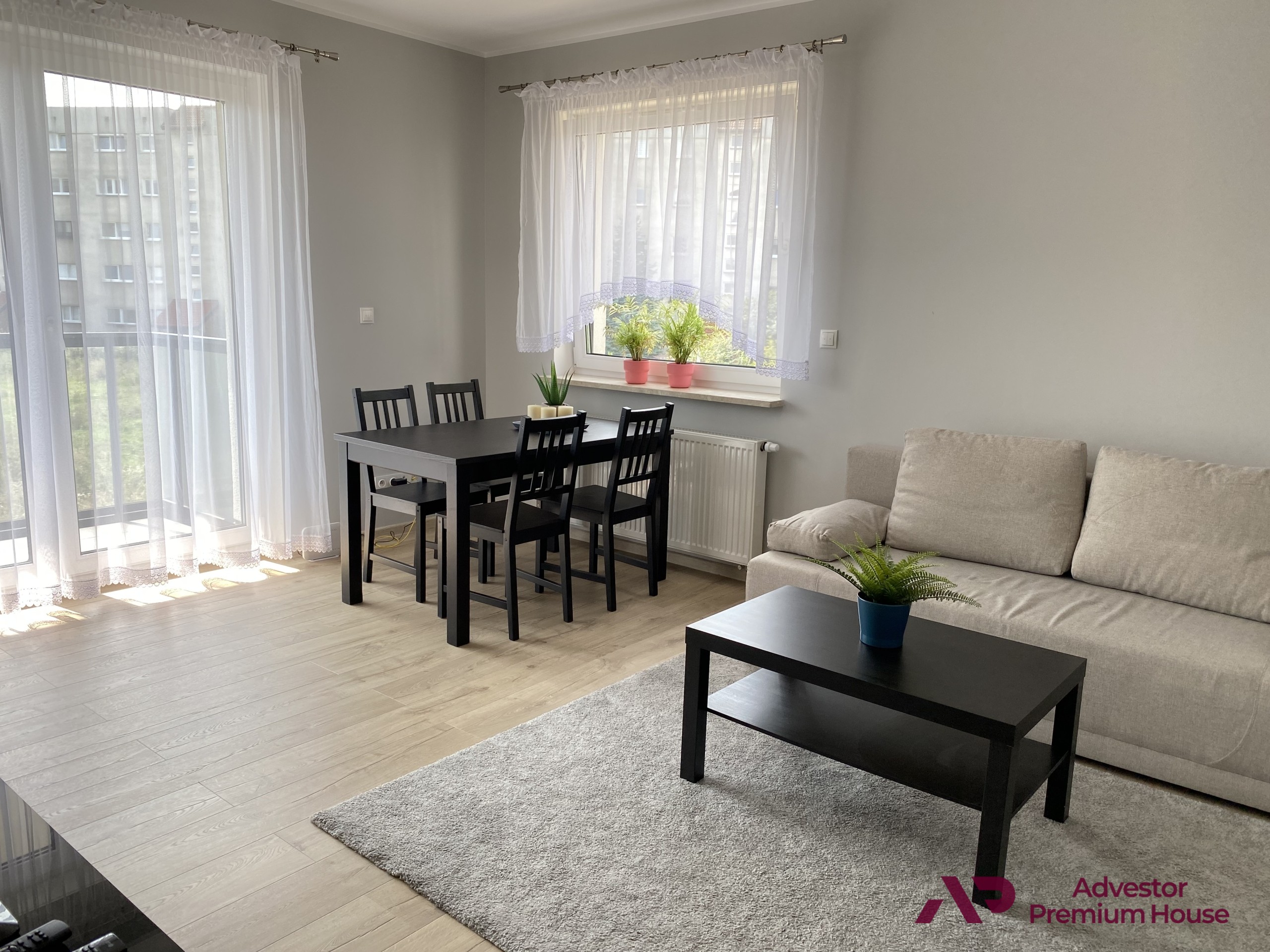 Mieszkanie jest w pełni umeblowane oraz wyposażone w płytę indukcyjną, piekarnik, lodówkę, zmywarkę, pralkę i telewizor. Wzdłuż ściany sypialni postawiono pojemną szafę typu komandor, która idealnie zapewnia miejsce na przechowywanie rzeczy.