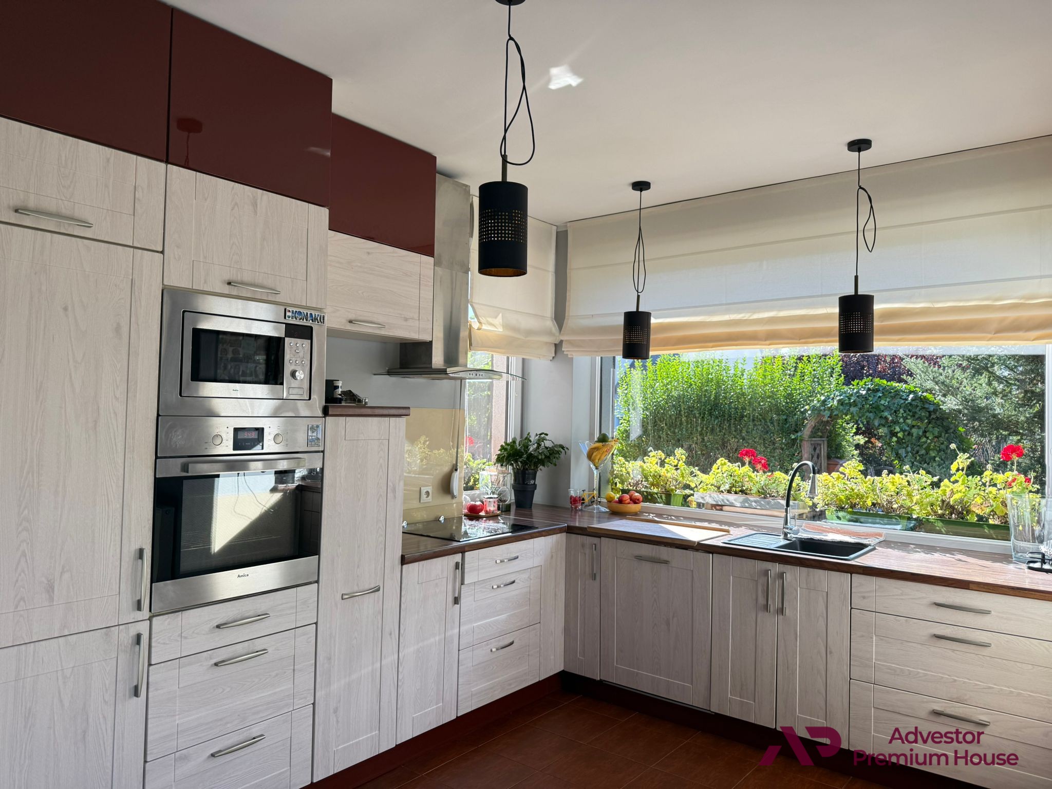 Na parterze znajduje się przestronny, jasny salon z kominkiem, który idealnie nadaje się do rodzinnych spotkań i relaksu. Duże okna zapewniają świetne doświetlenie wnętrza oraz widok na piękny ogród. Salon płynnie łączy się z jadalnią oraz funkcjonalną kuchnią, w której znajdziesz duże narożne okno oraz pełne wyposażenie w sprzęty AGD.