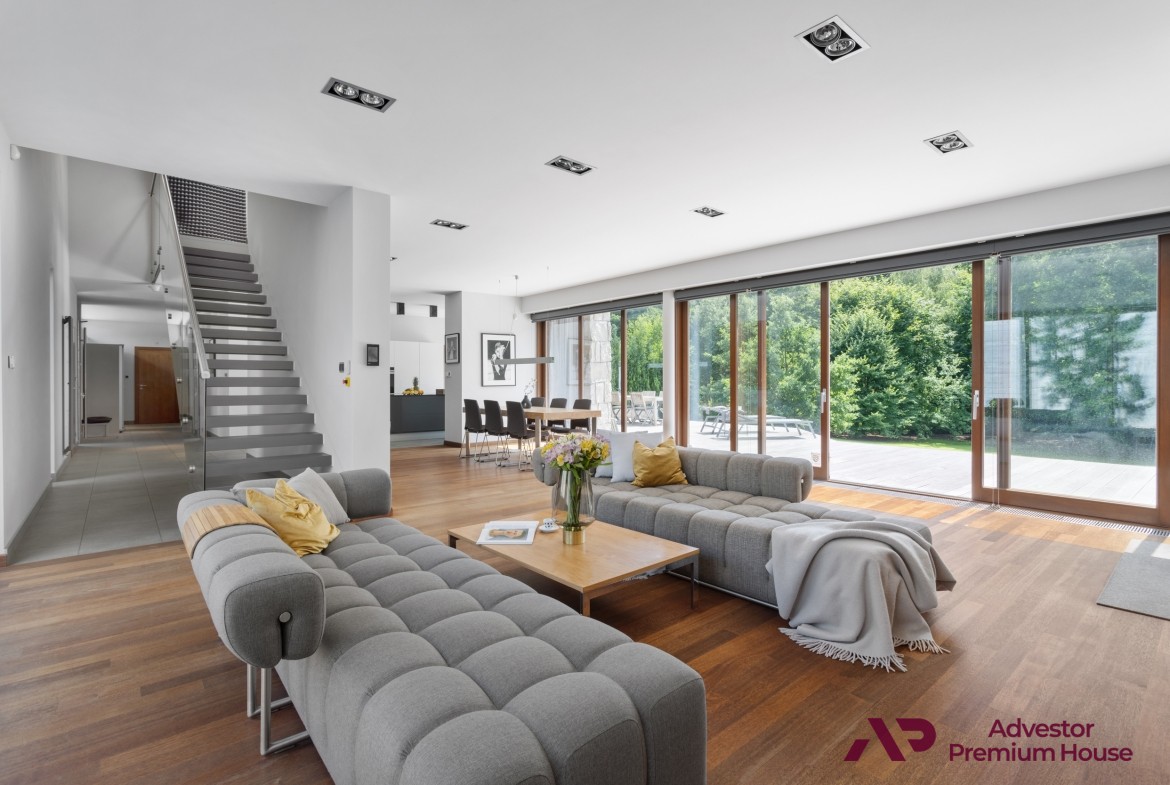 Można śmiało stwierdzić, że nieruchomość praktycznie odcięta jest od świata zewnętrznego. Intymność jest tu na najwyższym poziomie! Ale dzięki oknom na całą szerokość ściany, wychodzącym wprost na ogród i łączący się z nim prywatny kawałek lasu mamy do wyłącznej dyspozycji wspaniałą, naturalną przestrzeń o unikatowym charakterze. W tym miejscu, czujemy się jakby wokół nie było sąsiadów, ale nadal pozostajemy “wśród ludzi”.
