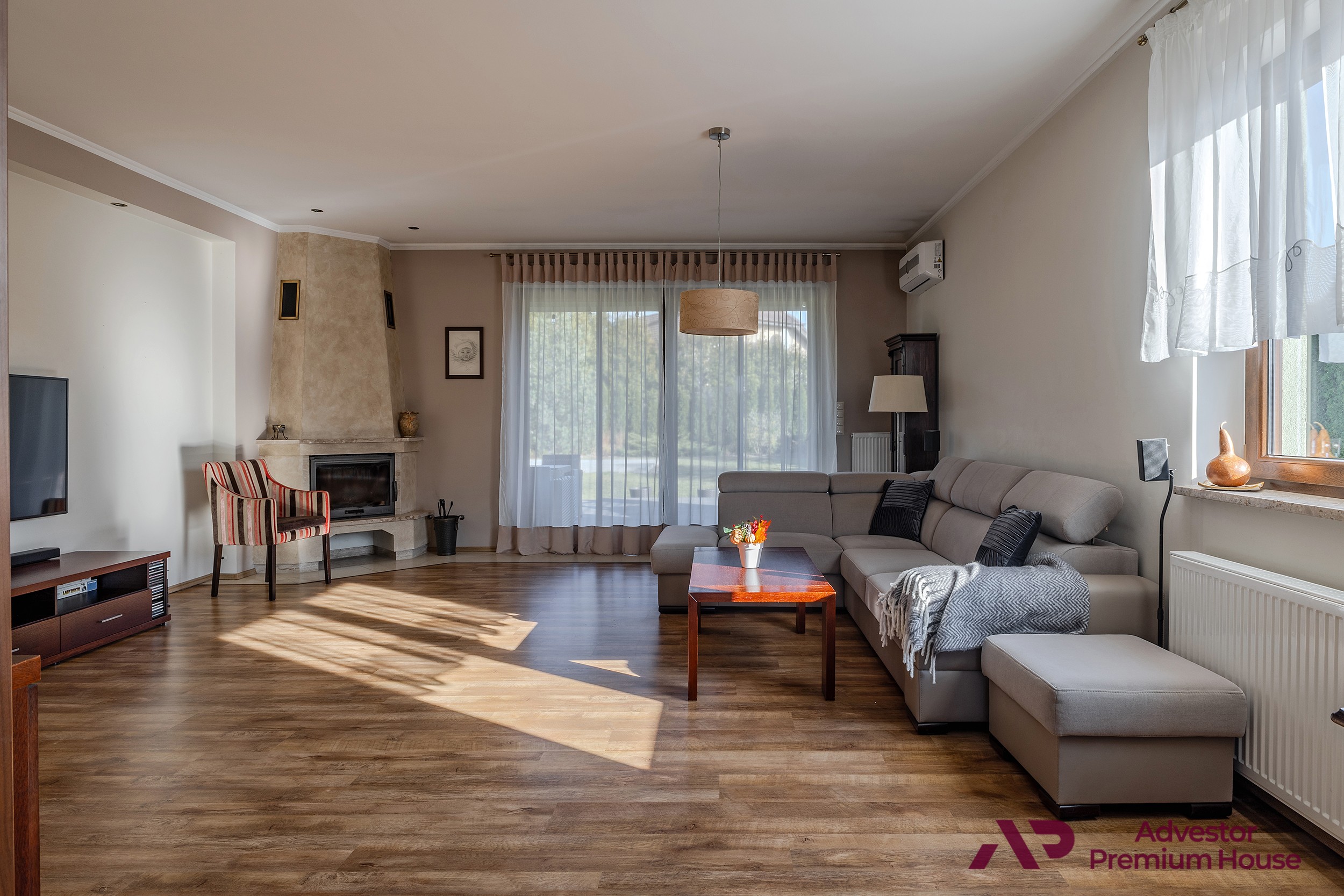 Wnętrze domu zostało zaprojektowane z myślą o komforcie i funkcjonalności. Centralnym punktem jest przestronny, jasny salon z dużym przesuwnym oknem, które prowadzi bezpośrednio na taras i do ogrodu. Dzięki temu wnętrze jest doskonale doświetlone naturalnym światłem przez cały dzień. W salonie znajduje się klimatyczny kominek, który wprowadza przytulny nastrój w chłodniejsze dni, a także klimatyzacja, zapewniająca komfort latem.