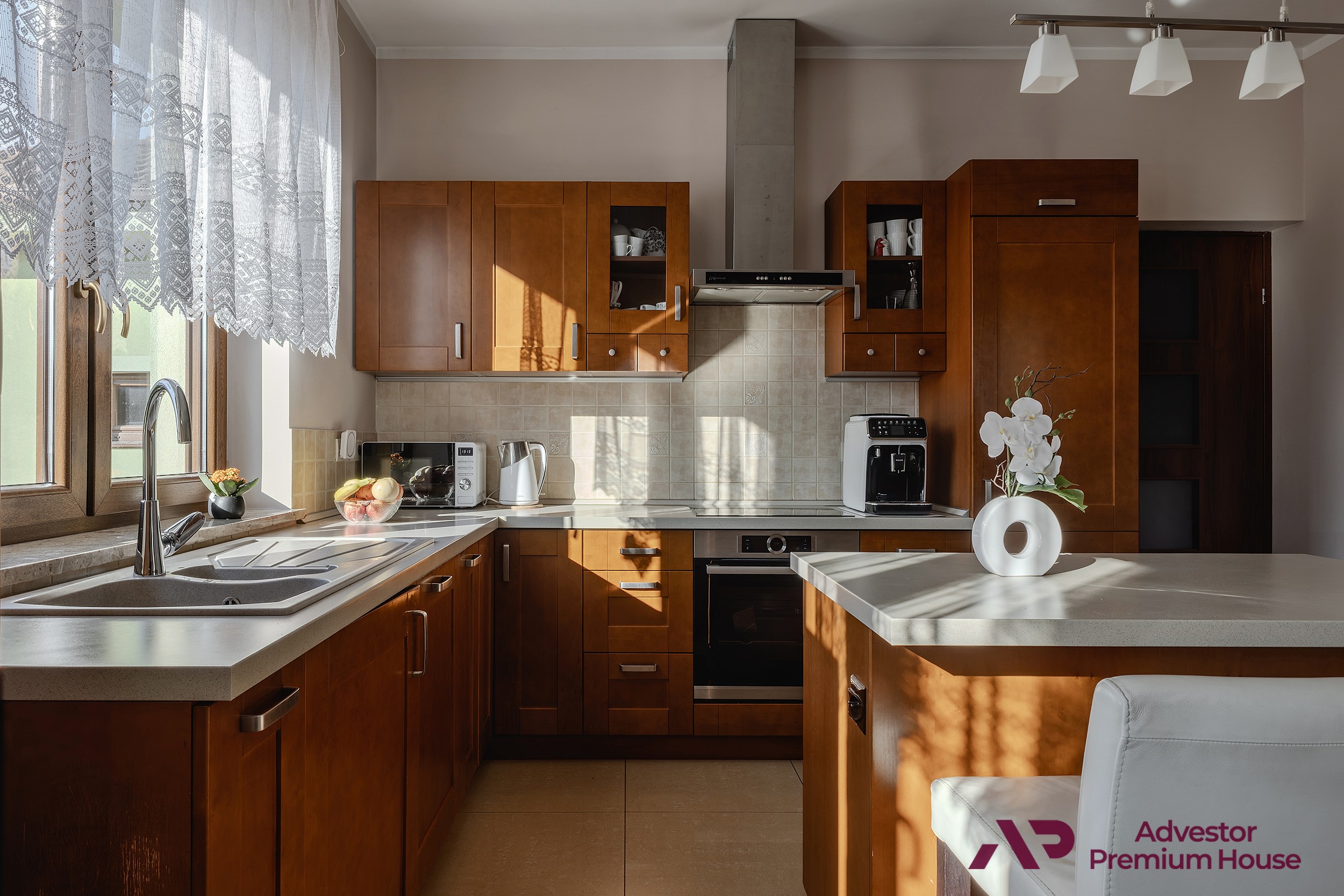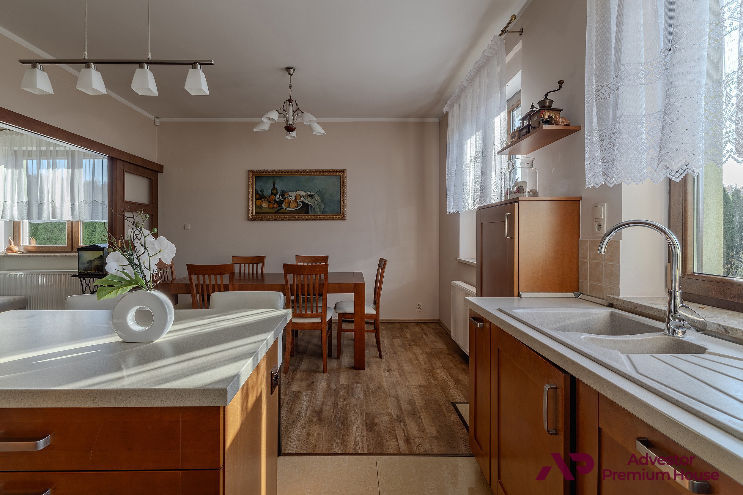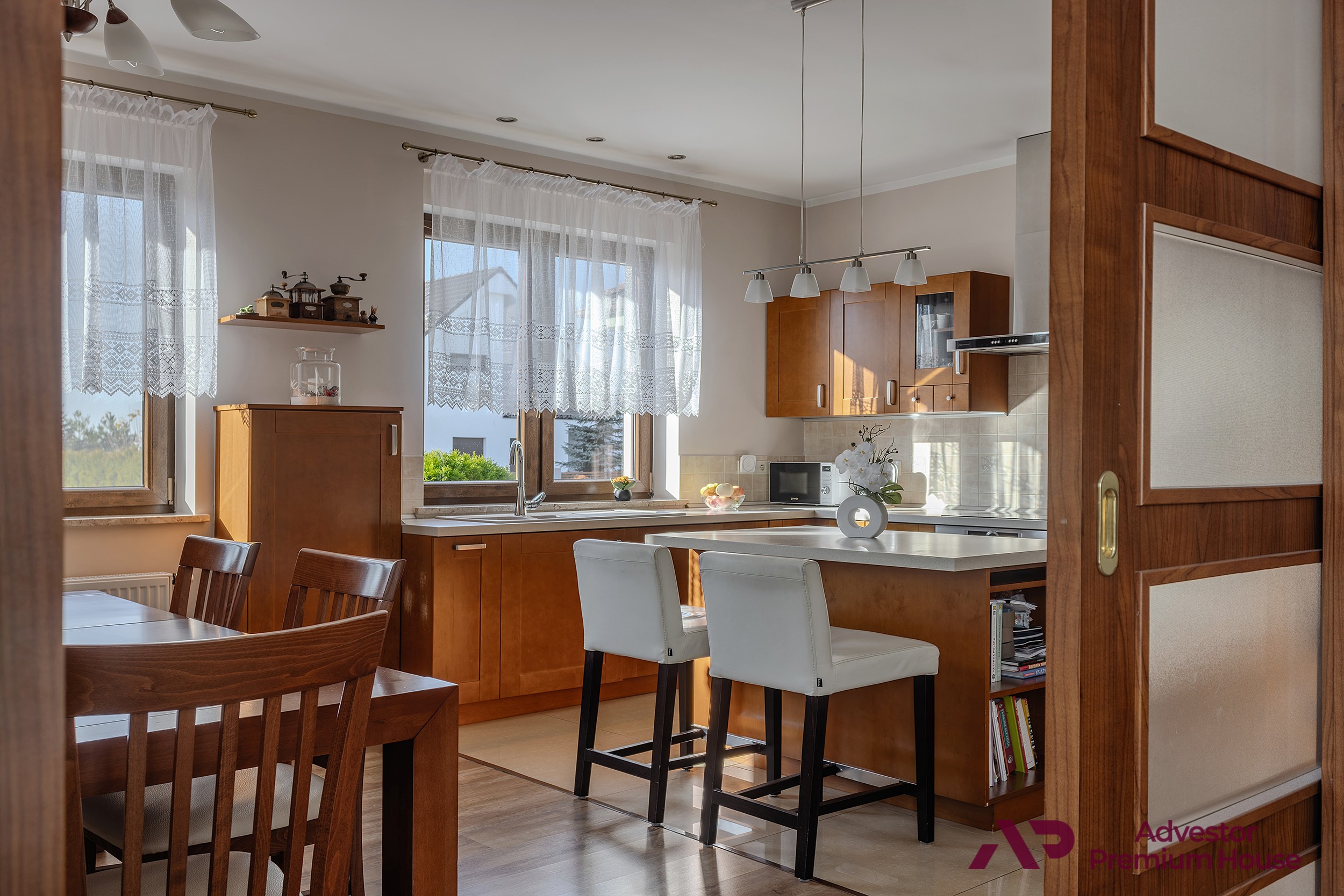 Dużym atutem nieruchomości jest oddzielna kuchnia z oknem. Pomieszczenie jest w pełni wyposażone w niezbędny sprzęt AGD, a jego charakter podkreślają drewniane fronty mebli, nadające wnętrzu ciepła i elegancji.