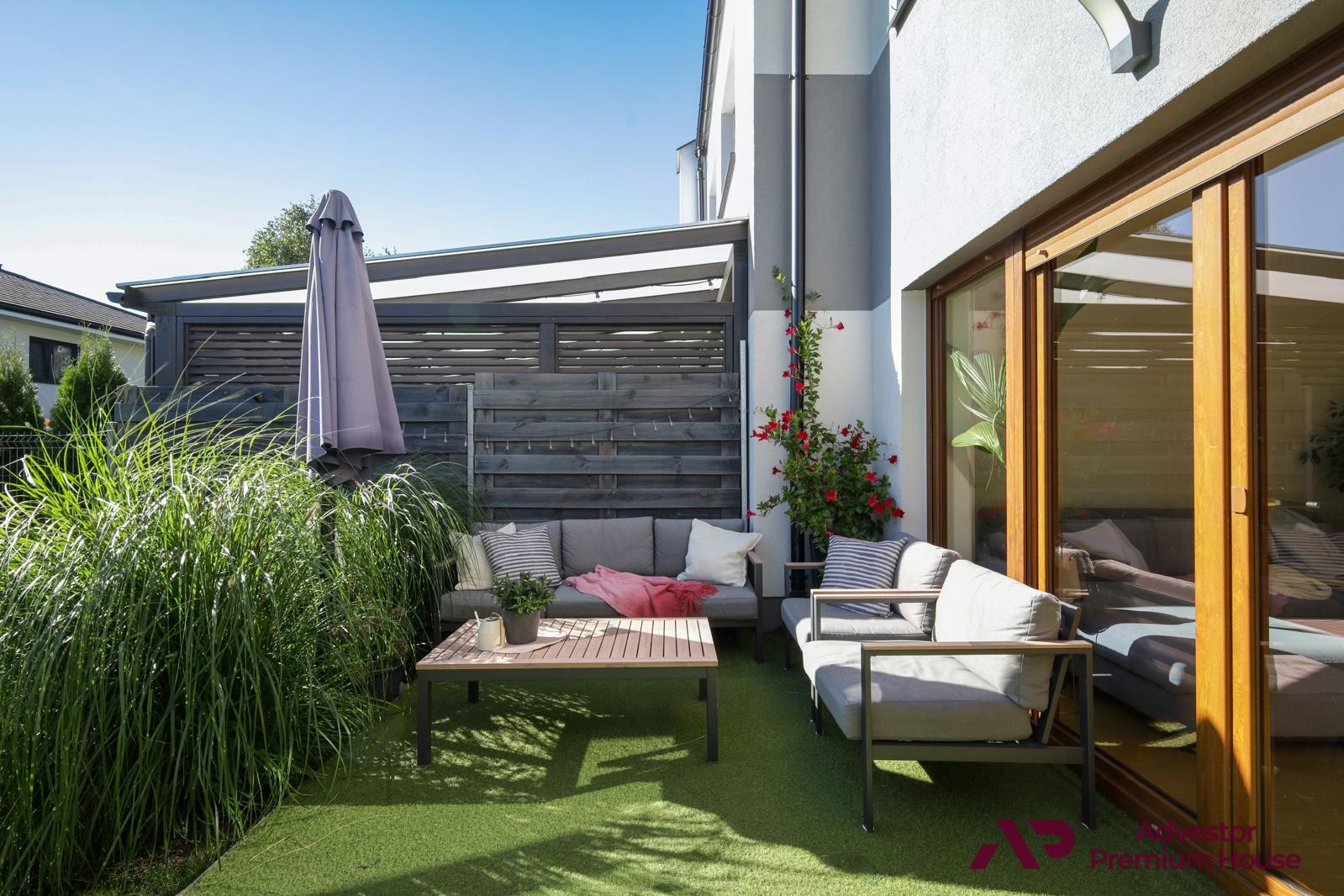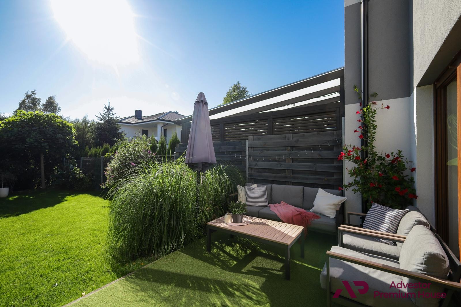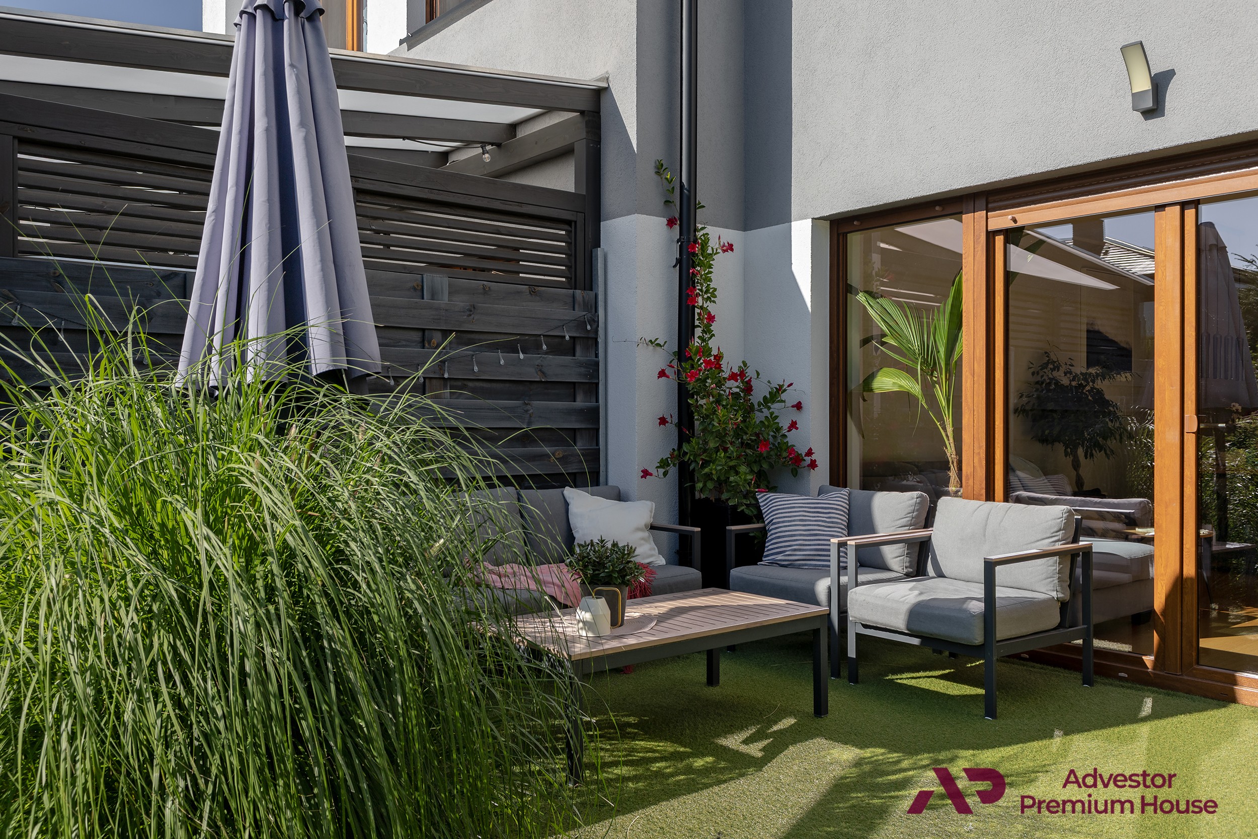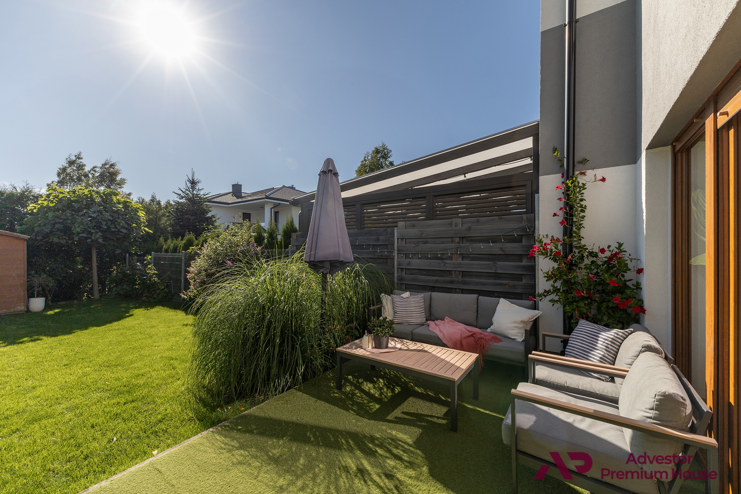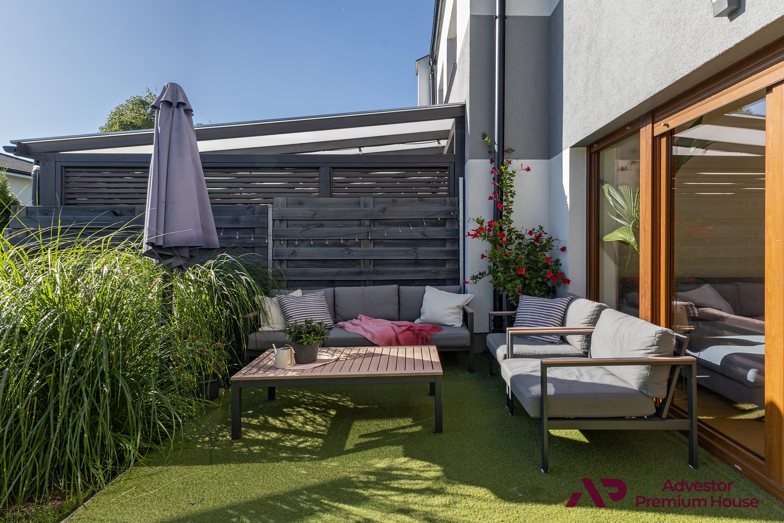 • taras z meblami ogrodowymi, który latem staje się sercem domu – doskonały na poranną kawę, rodzinne posiłki czy spotkania z przyjaciółmi,