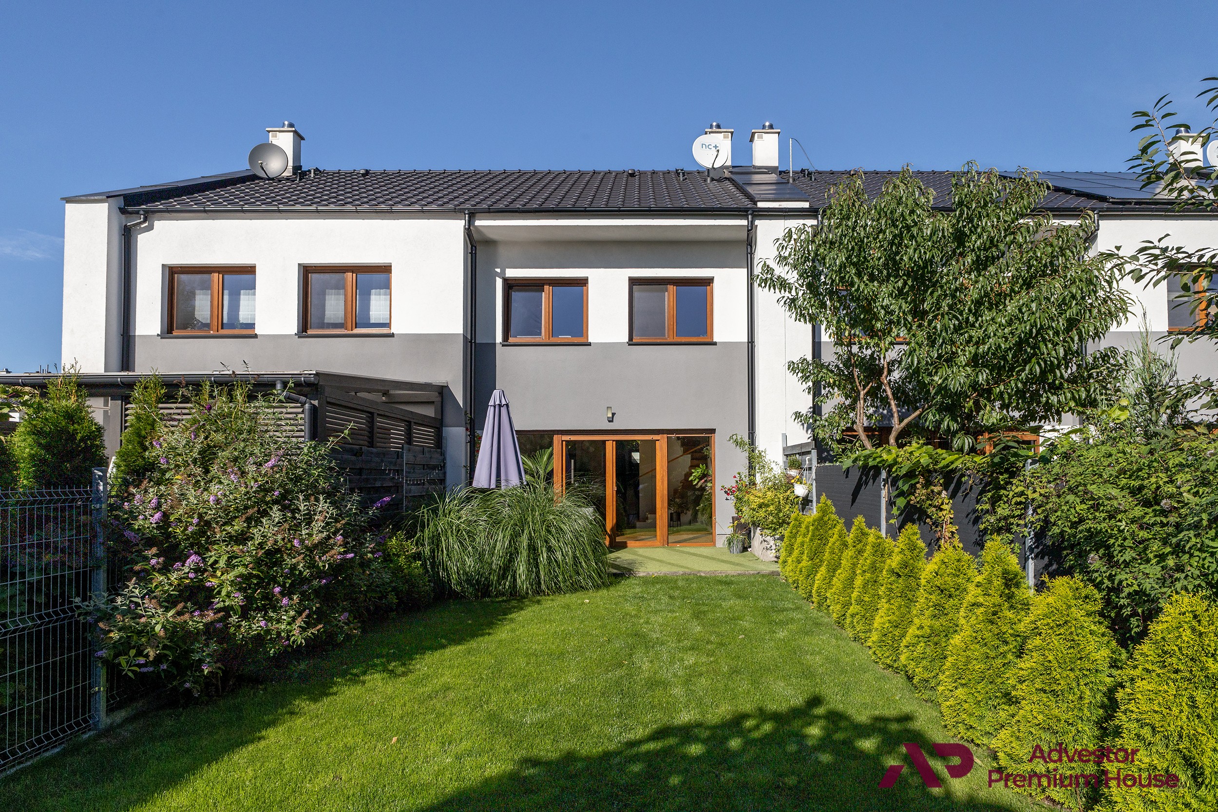 Przed budynkiem znajdują się dwa miejsca postojowe, a ogród wyposażono w domek gospodarczy – idealny na rowery czy narzędzia.
