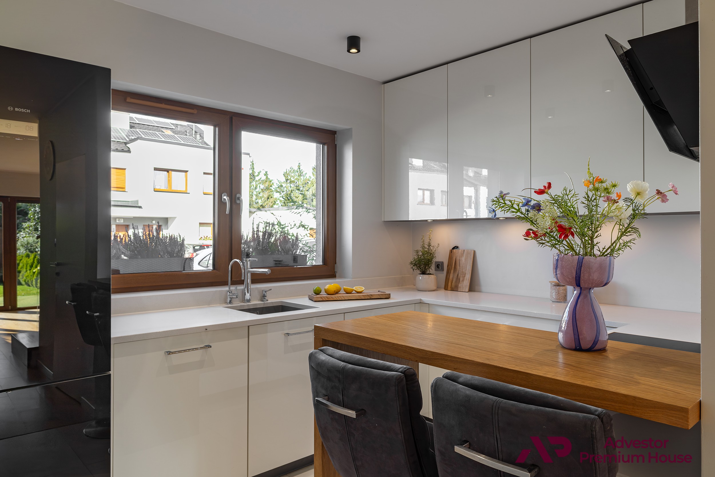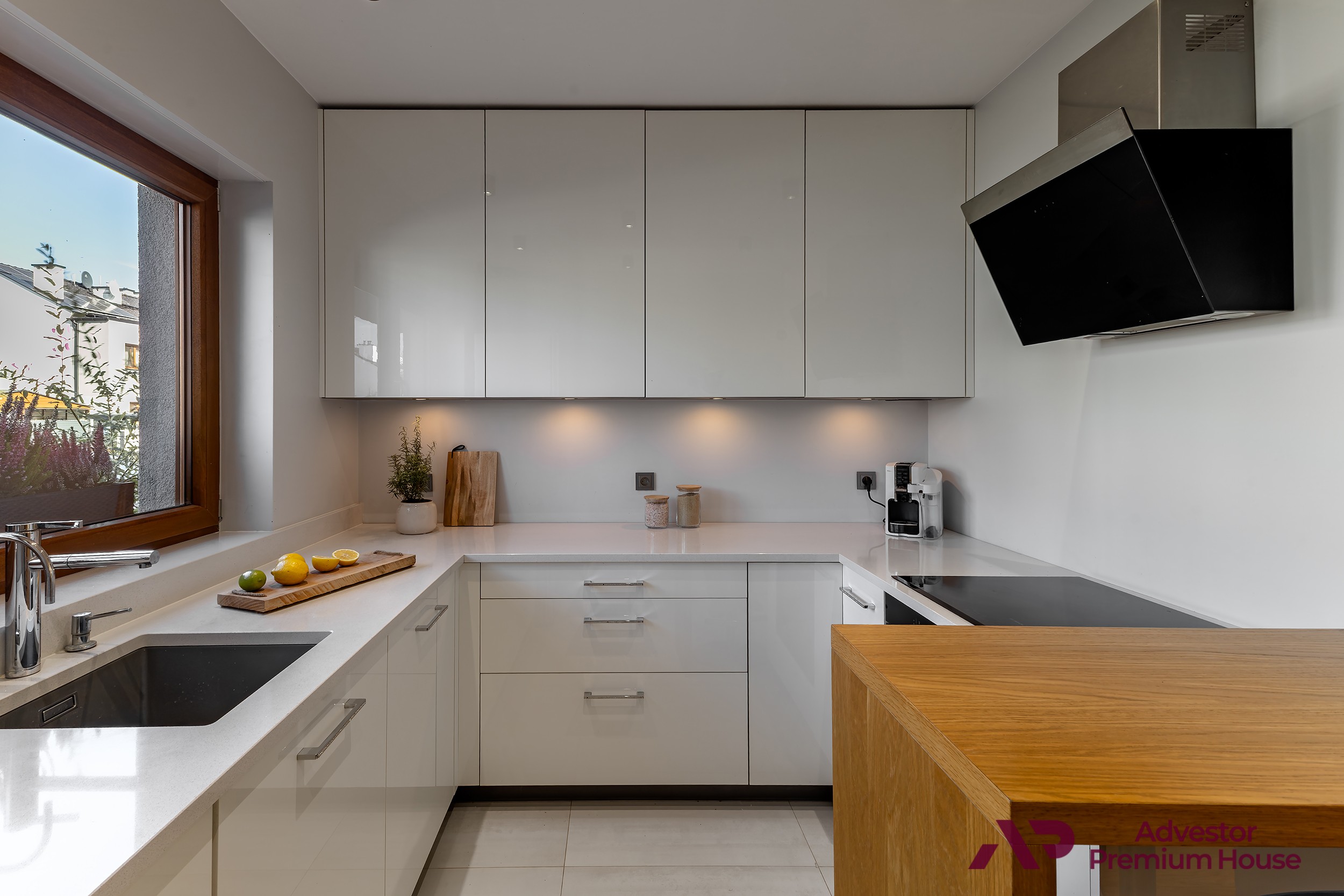 • Kuchnia (7,53 m²) – oddzielna, jasna i funkcjonalna, z dużym oknem. Blat wykonany został z wytrzymałego i łatwego w utrzymaniu czystości konglomeratu TechniStone.
