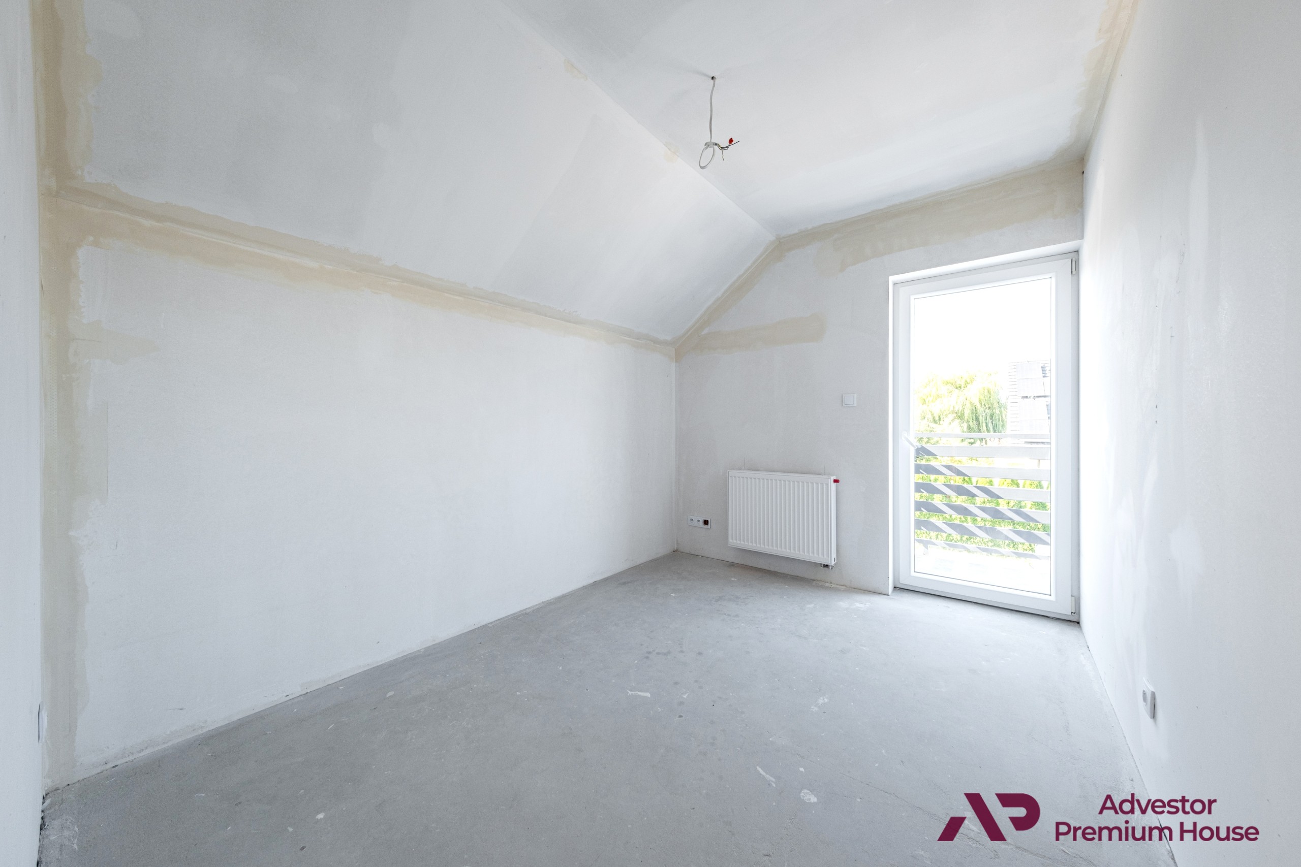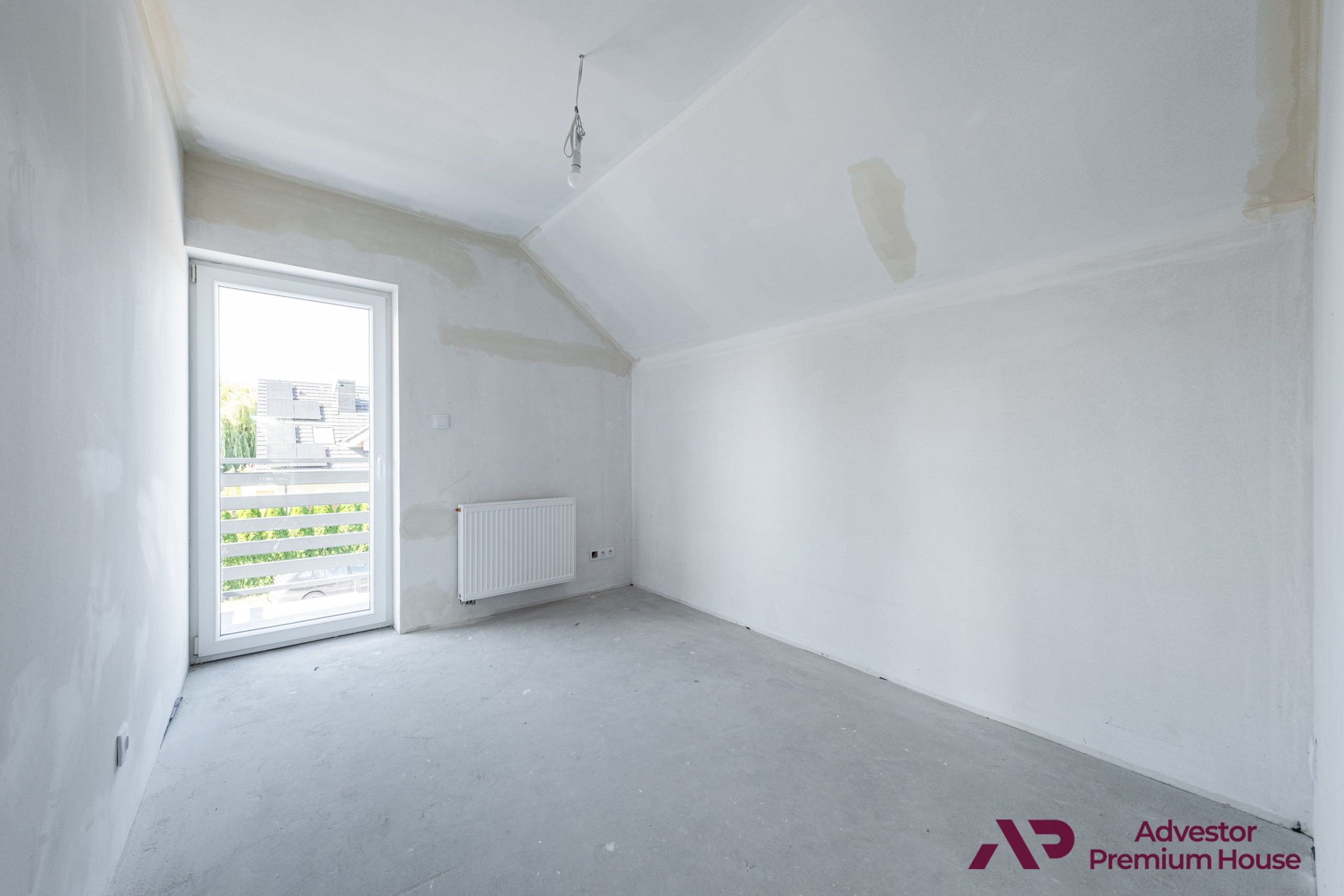 Na piętro prowadzą wygodne schody. Znajdują się tu trzy sypialnie oraz łazienka z ogrzewaniem podłogowym. Przestronny korytarz można dodatkowo zagospodarować, ustawiając w nim szafę lub komodę. Główna sypialnia posiada wydzieloną garderobę z oknem oraz balkon z widokiem na ogród. Dwa pozostałe pokoje mają wspólny balkon, co czyni przestrzeń bardziej funkcjonalną i wygodną.