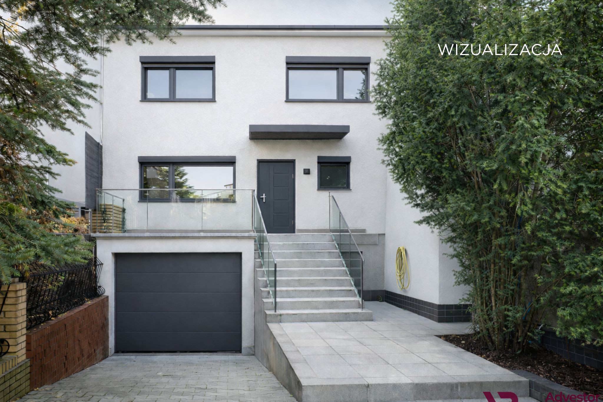 Działka o powierzchni 304 m² z podjazdem na dwa samochody oraz garażem jednostanowiskowym (ok. 19 m²).