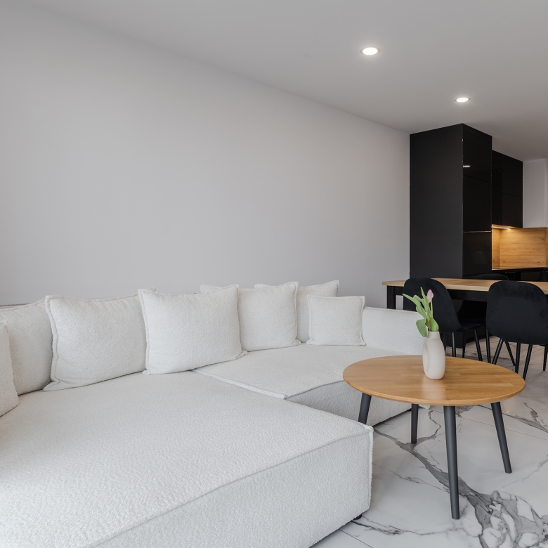 • przestronny salon z aneksem kuchennym,