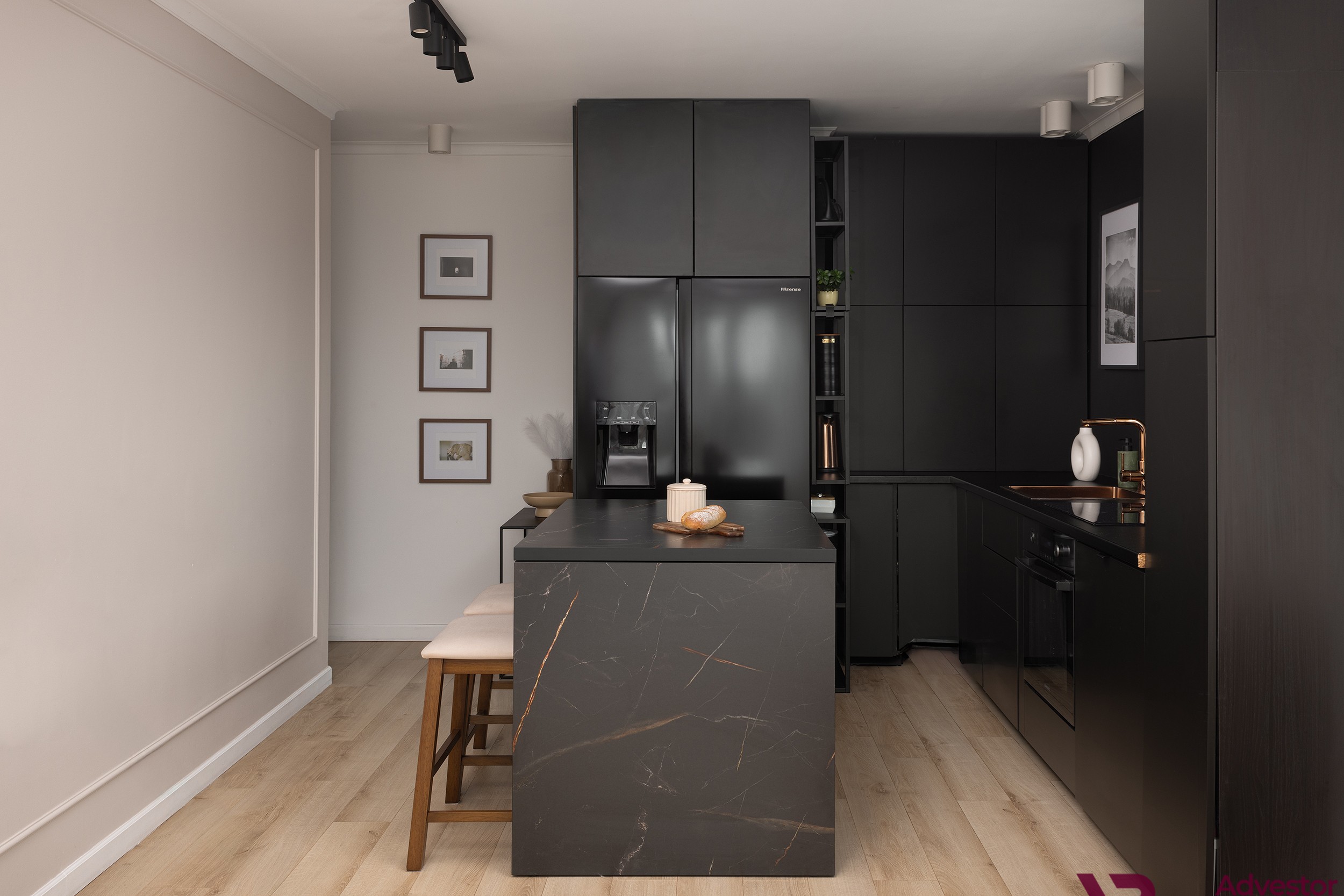 Wchodzisz do wnętrza, które ma charakter. Ciemniejsze ściany, spójne wykończenie i dopracowane detale tworzą przyjemny, bardziej wyrazisty klimat niż w typowych, neutralnych mieszkaniach.