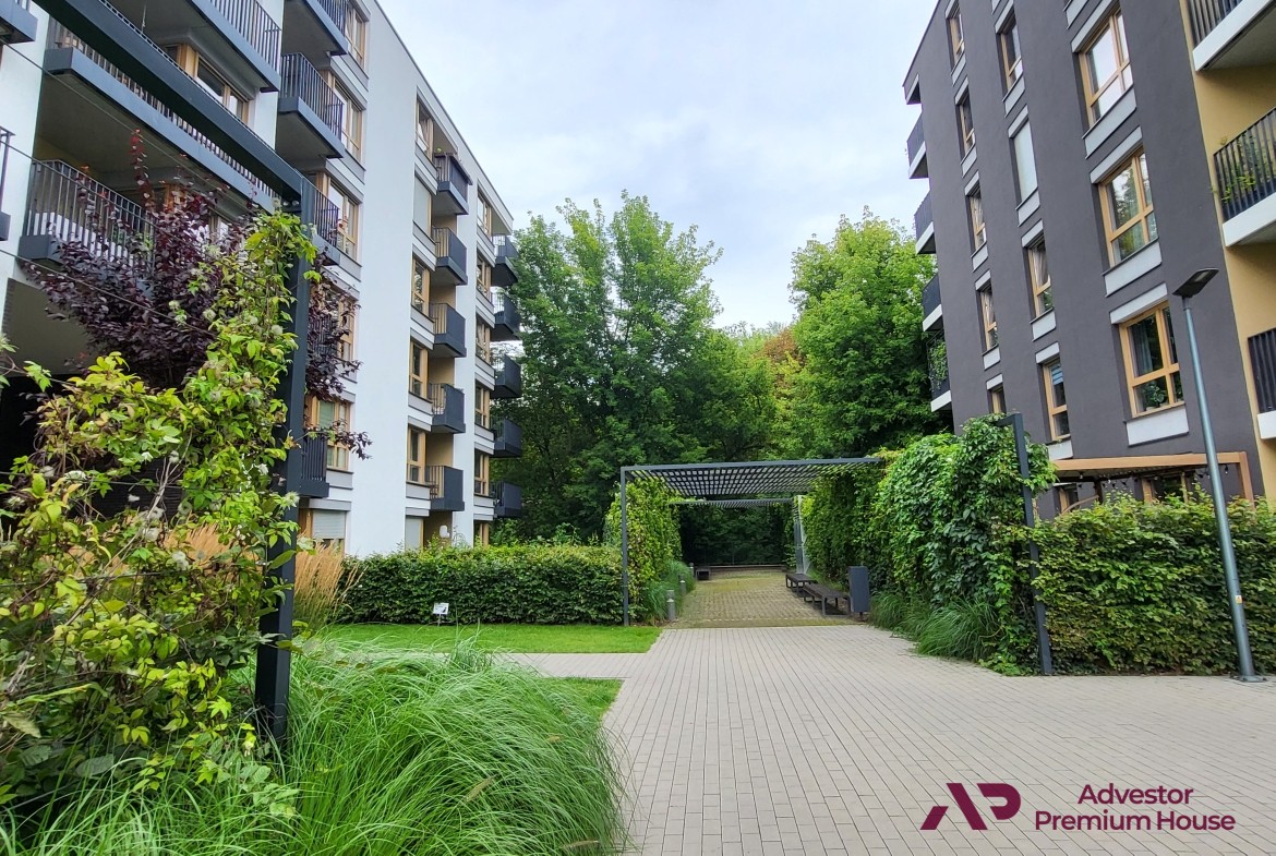 Osiedle otoczone jest zielenią – zadbane trawniki, liczne krzewy i przyjemne tereny rekreacyjne tworzą sprzyjające warunki do odpoczynku. Na dziedzińcu ustawiono ławki, a tuż przed wejściem do budynku znajdują się stojaki na rowery. Cały kompleks jest zamknięty i bezpieczny, zapewniając spokój oraz prywatność mieszkańców.