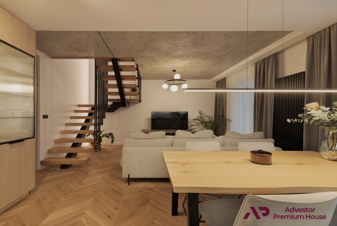 Mieszkanie było robione “pod siebie”, tym samym jest wykończone tylko wysokiej jakości materiałami i wyposażone w tej samej klasy sprzęty czy meble robione na zamówienie. Na podłogach mamy drewno. Gustowna, bardzo funkcjonalna i pojemna kuchnia ,czy świetnie zaprojektowane łazienki to tylko kilka wyróżników.