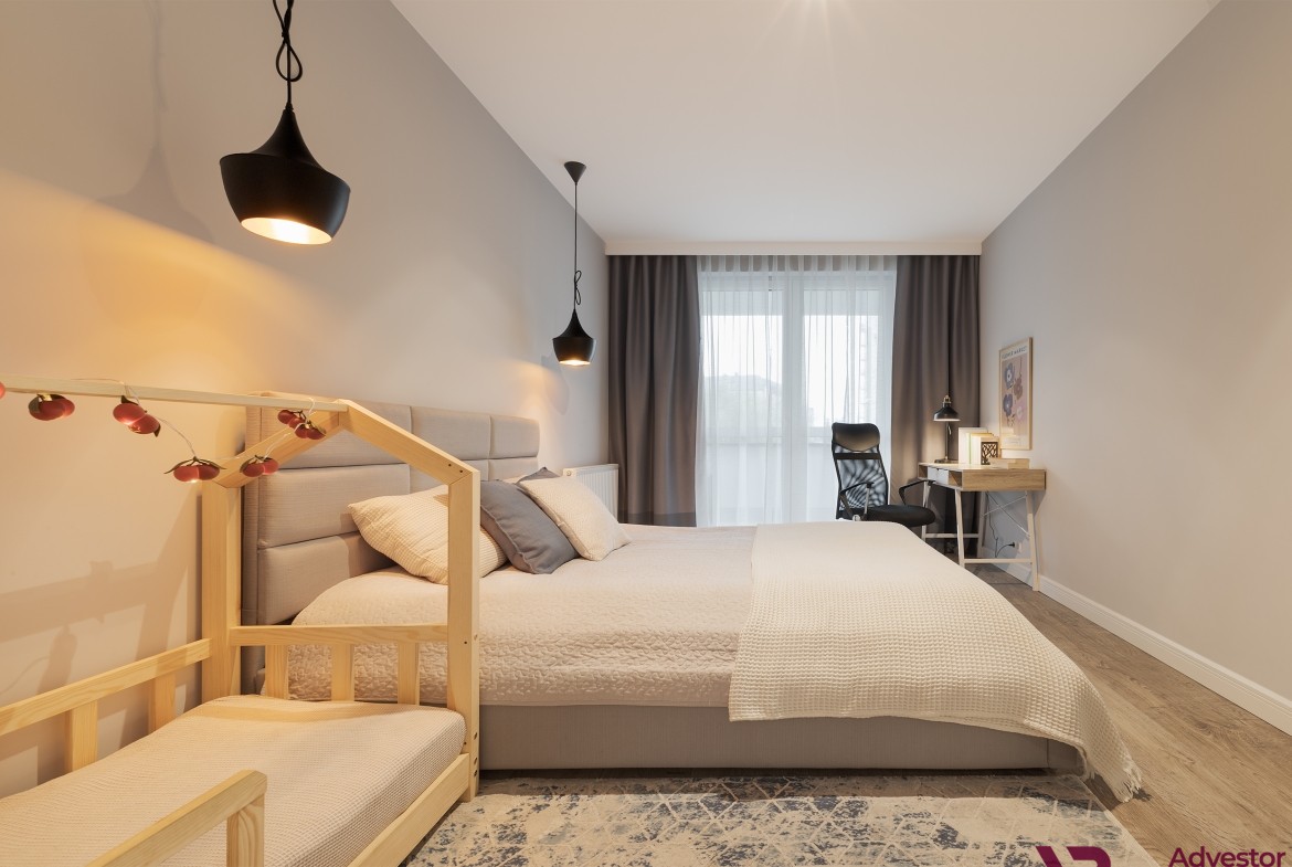 W prywatnej części mieszkania znajdziesz sypialnię z wydzieloną garderobą – Twoją osobistą oazę porannych przygotowań i wieczornego wyciszenia.