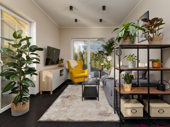 Przejdź do przestrzeni dziennej – salon z aneksem kuchennym, gdzie wyspa kuchenna zachęca do wspólnego gotowania, a wygodna strefa wypoczynku sprzyja relaksowi przy porannej kawie.