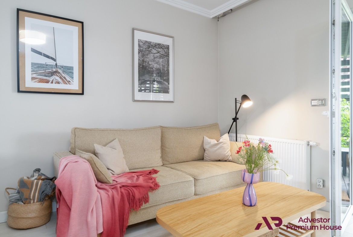 Z salonu jest bezpośrednie wyjście do ogródka, który latem staje się naturalnym przedłużeniem wnętrza.