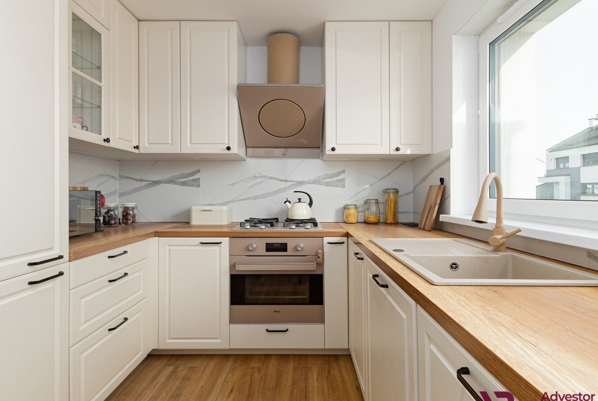 - Kuchnia (7,45 m²) – jasna, z dużym oknem, nowoczesną zabudową meblową i sprzętami AGD (użytkowana niespełna rok), z przestrzenią do gotowania i szybkich posiłków.