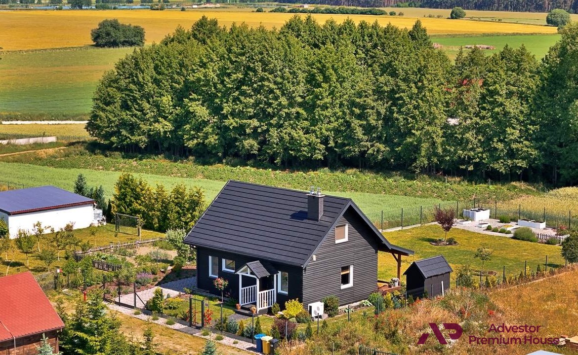 Dom o powierzchni użytkowej 83,46 m² (powierzchnia całkowita to około 100 m²) został wzniesiony w 2022 roku w technologii szkieletowej, na solidnych fundamentach. Drewniana elewacja i zadaszony taras nadają mu wyjątkowego, rustykalnego charakteru, który wyróżnia go spośród innych nieruchomości w okolicy.