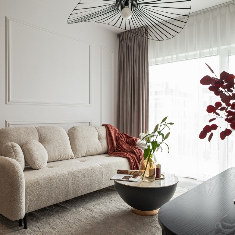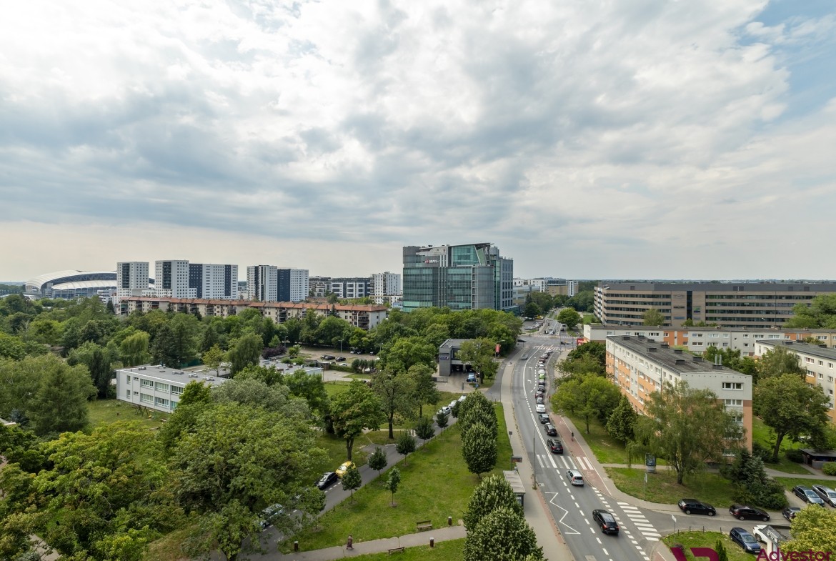 Mieszkanie znajduje się na dziesiątym, ostatnim piętrze wysokiego budynku, co zapewnia wyjątkowe poczucie przestrzeni i prywatności. Z balkonu rozpościera się szeroki widok – z jednej strony na panoramę Poznania i stadion miejski, z drugiej na otaczające budynek tereny zielone. To rzadkie połączenie miejskiego krajobrazu z naturalnym otoczeniem tworzy niepowtarzalny klimat tego miejsca.
